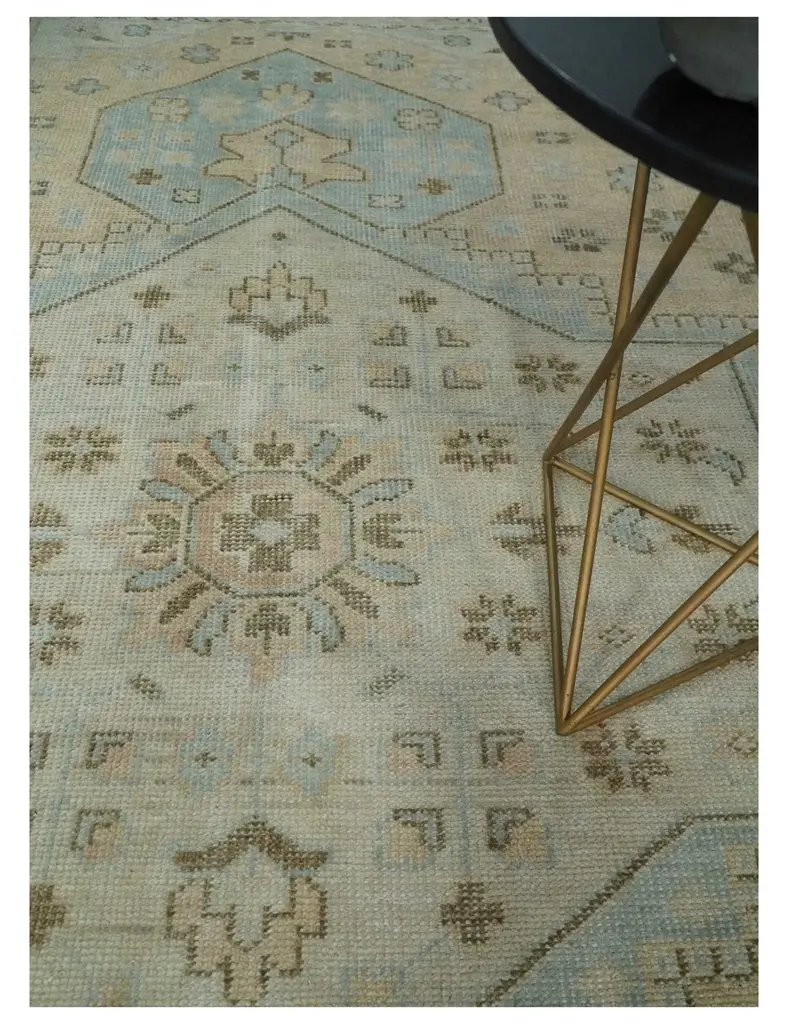 This custom-made traditional area rug is hand-knotted with wool featuring a classic antique-style medallion design in Silver, Peach, Gray, and Olive. Perfect for a timeless look that can elevate any room in your home. Hand-Knotted Rug All sizes are made to order in 30-60 days Made with Wool Color: Silver, Peach, Gray and Olive Made with 22 knots per square inch This specific rug is made in India, in the city of Bhadohi. Bhadohi is one of the biggest rug manufacturing cities. Carpet weaving in the region dates back to the 16th century during the reign of Akbar. The skilled artisans of Bhadohi have been carrying the tradition of rug-making for centuries. USERS GUIDE Avoid prolonged moisture Vacuum regularly and/or shake to remove dust Do not pull any loose threads. Use scissors to simply cut the ends Blot spills immediately with a white cloth. Harsh chemicals may damage or fade the rug Use rug protectors under heavy furniture