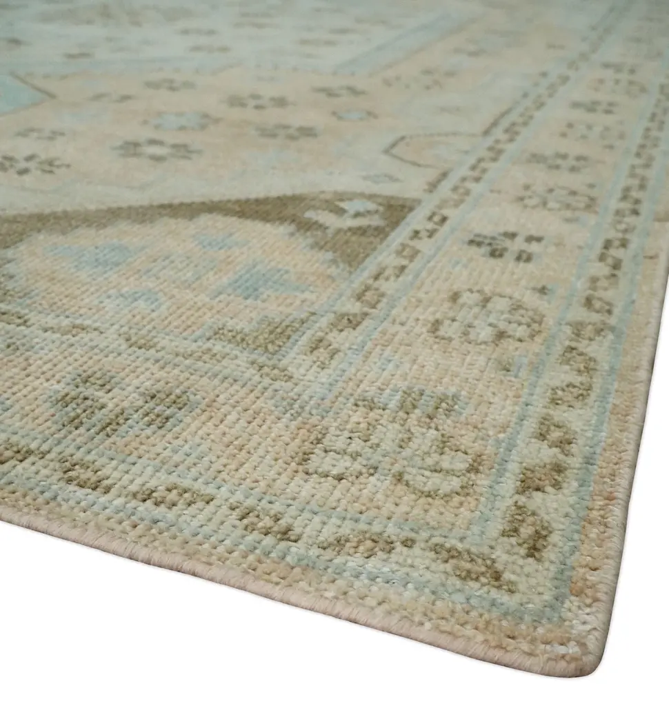 This custom-made traditional area rug is hand-knotted with wool featuring a classic antique-style medallion design in Silver, Peach, Gray, and Olive. Perfect for a timeless look that can elevate any room in your home. Hand-Knotted Rug All sizes are made to order in 30-60 days Made with Wool Color: Silver, Peach, Gray and Olive Made with 22 knots per square inch This specific rug is made in India, in the city of Bhadohi. Bhadohi is one of the biggest rug manufacturing cities. Carpet weaving in the region dates back to the 16th century during the reign of Akbar. The skilled artisans of Bhadohi have been carrying the tradition of rug-making for centuries. USERS GUIDE Avoid prolonged moisture Vacuum regularly and/or shake to remove dust Do not pull any loose threads. Use scissors to simply cut the ends Blot spills immediately with a white cloth. Harsh chemicals may damage or fade the rug Use rug protectors under heavy furniture