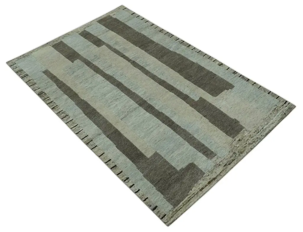 This hand-knotted wool rug boasts a modern design with a striking color palette of silver, ivory, and charcoal. Its geometric pattern adds visual interest to any space. Crafted with high-quality materials, this multi-size rug is a durable and stylish addition to your home decor. Hand-Knotted Rug Made with Wool Color: Silver, Ivory and Charcoal ALL SIZES ARE MADE TO ORDER 30 - 60 Days These rugs have been made for centuries and carry a tradition and art. This specific rug is made in India, in the city of Bhadohi. Bhadohi is one of the biggest rug manufacturing cities. Carpet weaving in the region dates back to the 16th century during the reign of Akbar. The skilled artisans of Bhadohi have been carrying the rug-making tradition for centuries. USERS GUIDE Avoid prolonged moisture Vacuum regularly and shake to remove dust Do not pull any loose threads. Use scissors to simply cut the ends The blot spills immediately with a white cloth. Harsh chemicals may damage or fade the rug Use rug protectors under heavy furniture