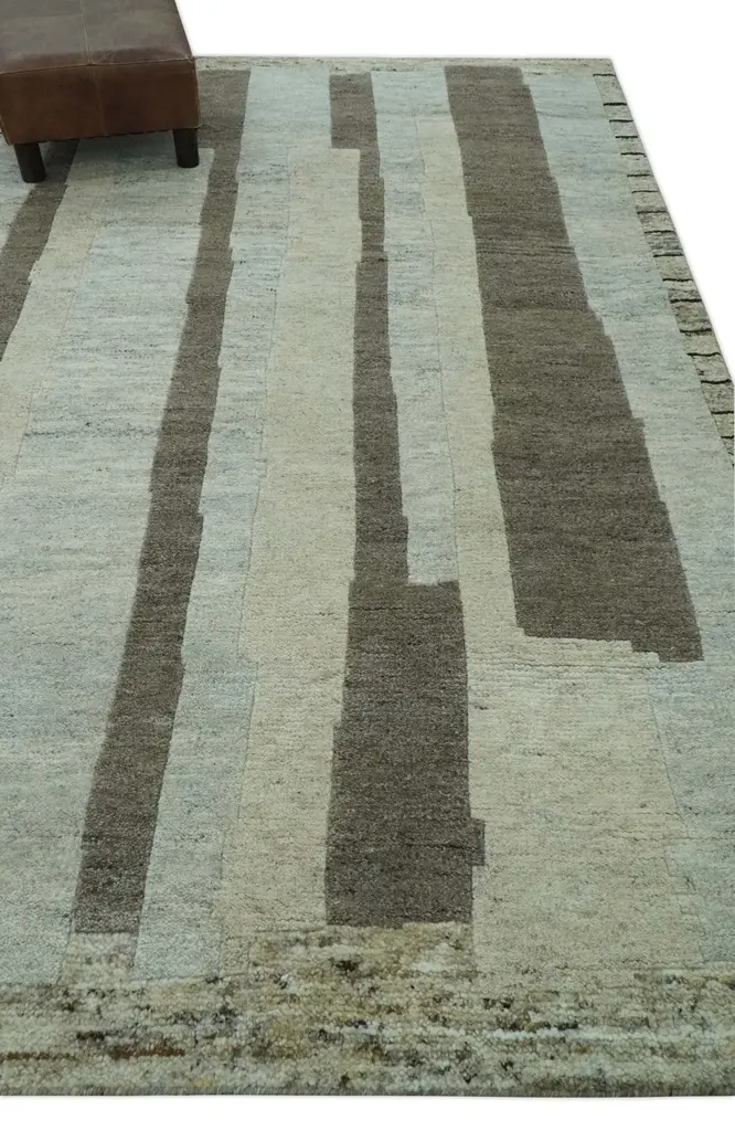 This hand-knotted wool rug boasts a modern design with a striking color palette of silver, ivory, and charcoal. Its geometric pattern adds visual interest to any space. Crafted with high-quality materials, this multi-size rug is a durable and stylish addition to your home decor. Hand-Knotted Rug Made with Wool Color: Silver, Ivory and Charcoal ALL SIZES ARE MADE TO ORDER 30 - 60 Days These rugs have been made for centuries and carry a tradition and art. This specific rug is made in India, in the city of Bhadohi. Bhadohi is one of the biggest rug manufacturing cities. Carpet weaving in the region dates back to the 16th century during the reign of Akbar. The skilled artisans of Bhadohi have been carrying the rug-making tradition for centuries. USERS GUIDE Avoid prolonged moisture Vacuum regularly and shake to remove dust Do not pull any loose threads. Use scissors to simply cut the ends The blot spills immediately with a white cloth. Harsh chemicals may damage or fade the rug Use rug protectors under heavy furniture
