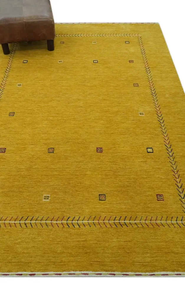 This luxurious rug features a warm, golden mustard hue that exudes sophistication and warmth. Its minimalist design is punctuated by small, subtle geometric motifs in muted tones. The border is delicately adorned with a series of intricate, interlocking chevron patterns that provide an elegant frame. Crafted from plush, high-quality fibers, the rug boasts a soft, inviting texture, making it perfect for adding a touch of understated glamour to any upscale living space. Product Details Color: Mustard Design: Modern Tribal Design Material: Wool Construction: Hand-loom Availability: All sizes, Made to order in 30-45 days Care Guide Keep dry and away from water exposure Clean dust by vacuuming and shaking outdoors weekly Trim loose threads with scissors - never pull them Blot spills gently with clean white cloth; avoid chemical cleaners Place protective pads under furniture legs