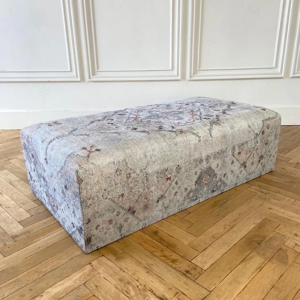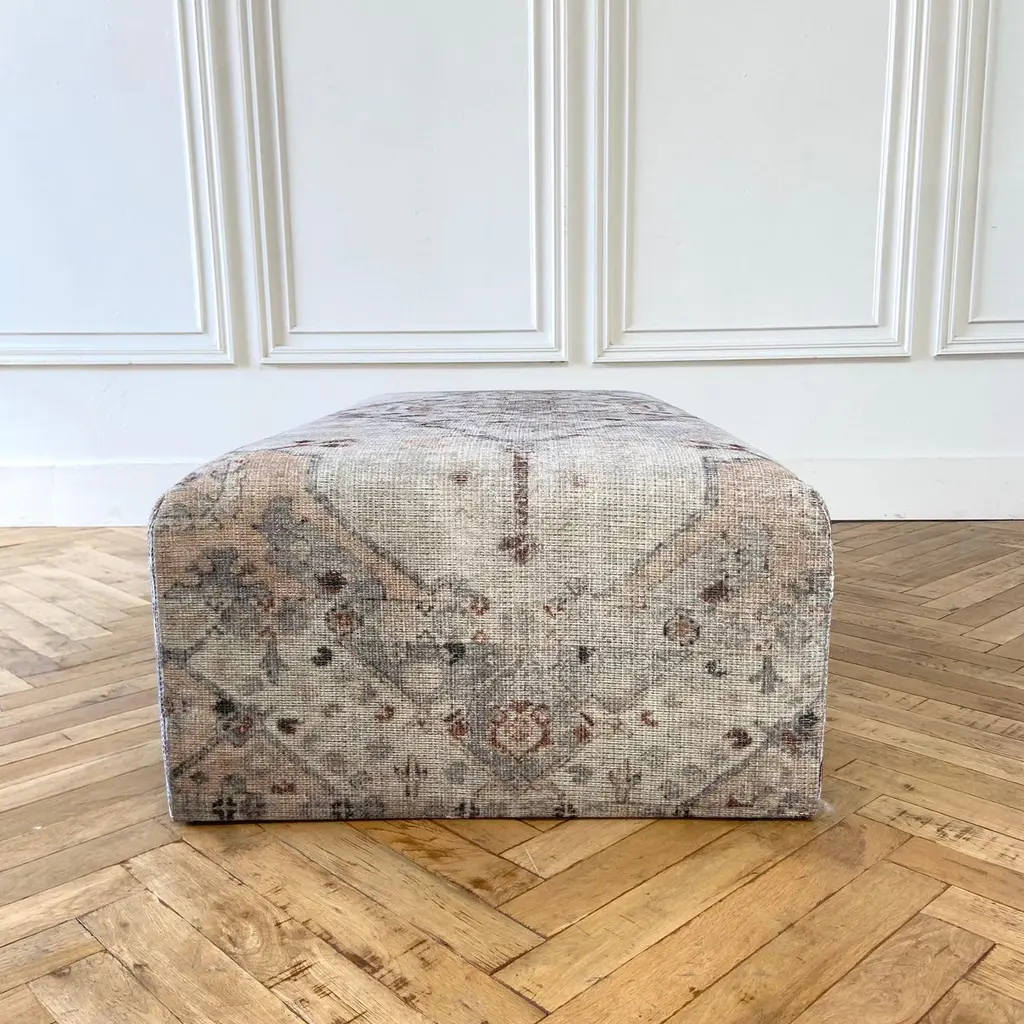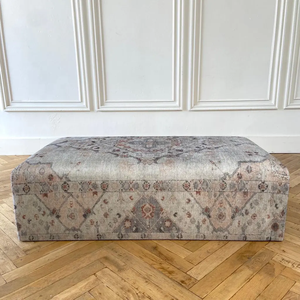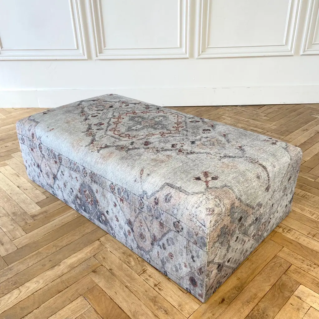 Custom made cube style ottoman. This can be remade and ordered to any size. The rug we are using is a new "vintage look" turkish flat weave style with nano technology. Meaning this can be wiped clean easily, it has a stain proof barrier to resist stains. These rugs have also been treated with the "fur-friendly" which is a patented technology that provides natural allergen control. These rugs now give your family some extra protection at home from any allergens from dust and pets. Measures: Cocktail ottoman shown 56” W x 30” D x 17” HColors: Blue, gray, rust, apricot, taupe.