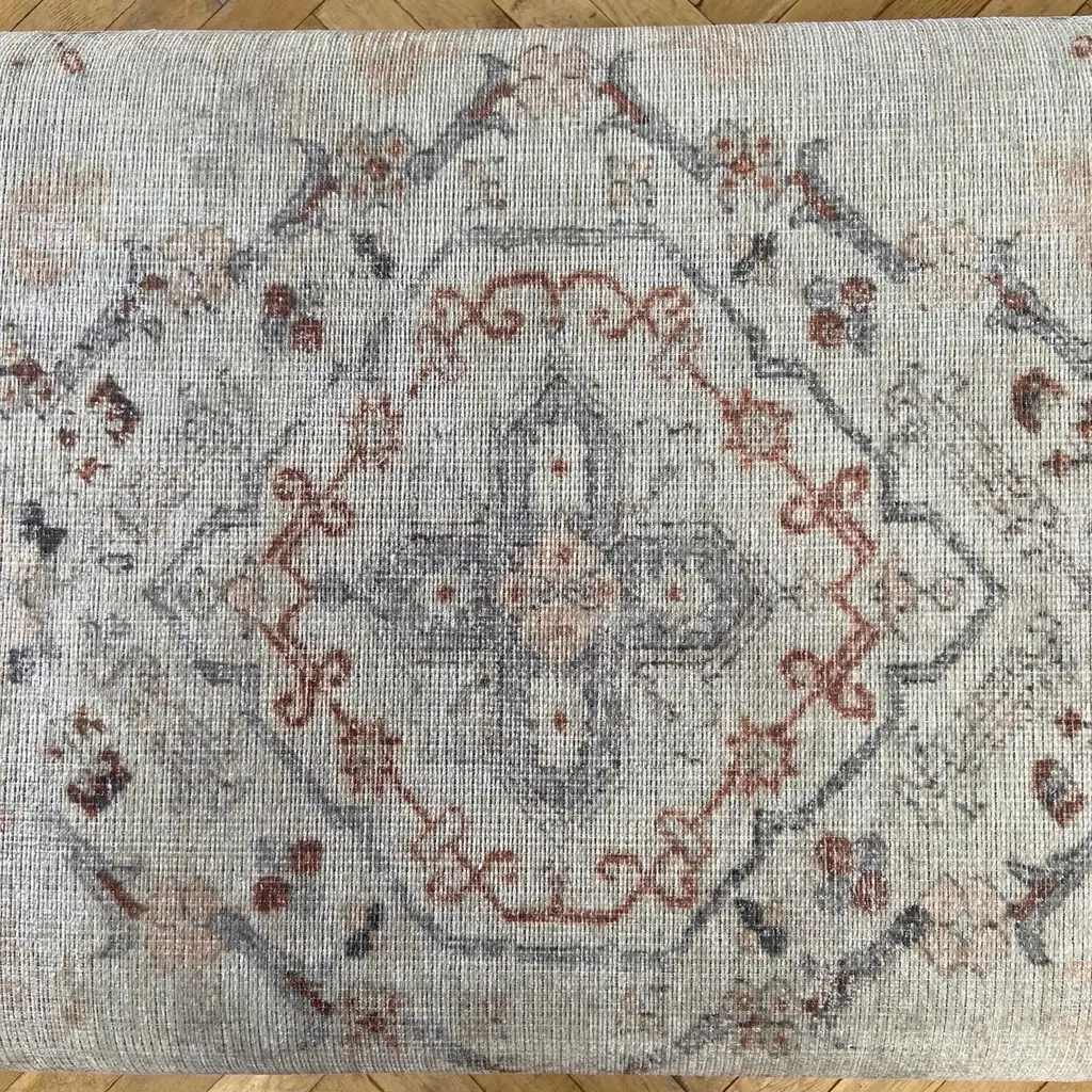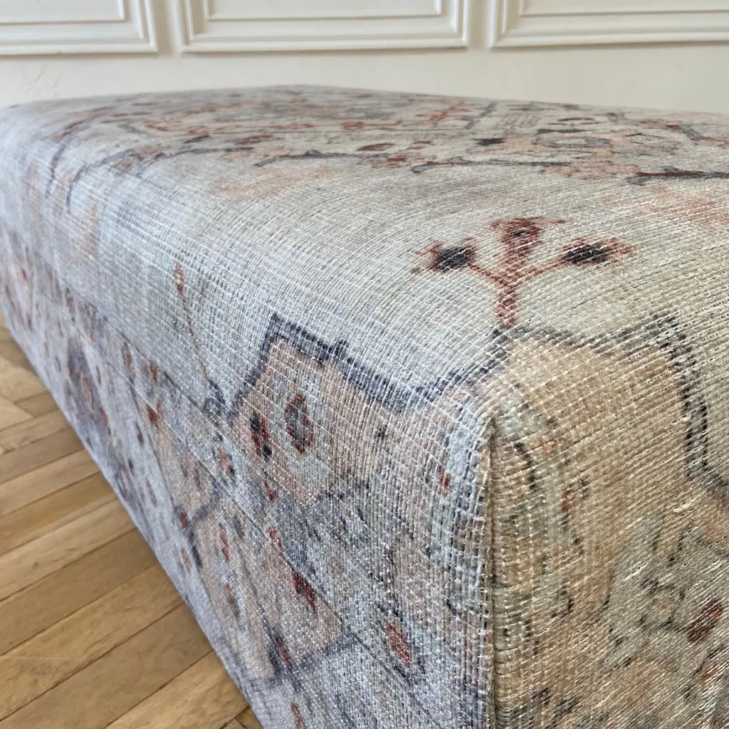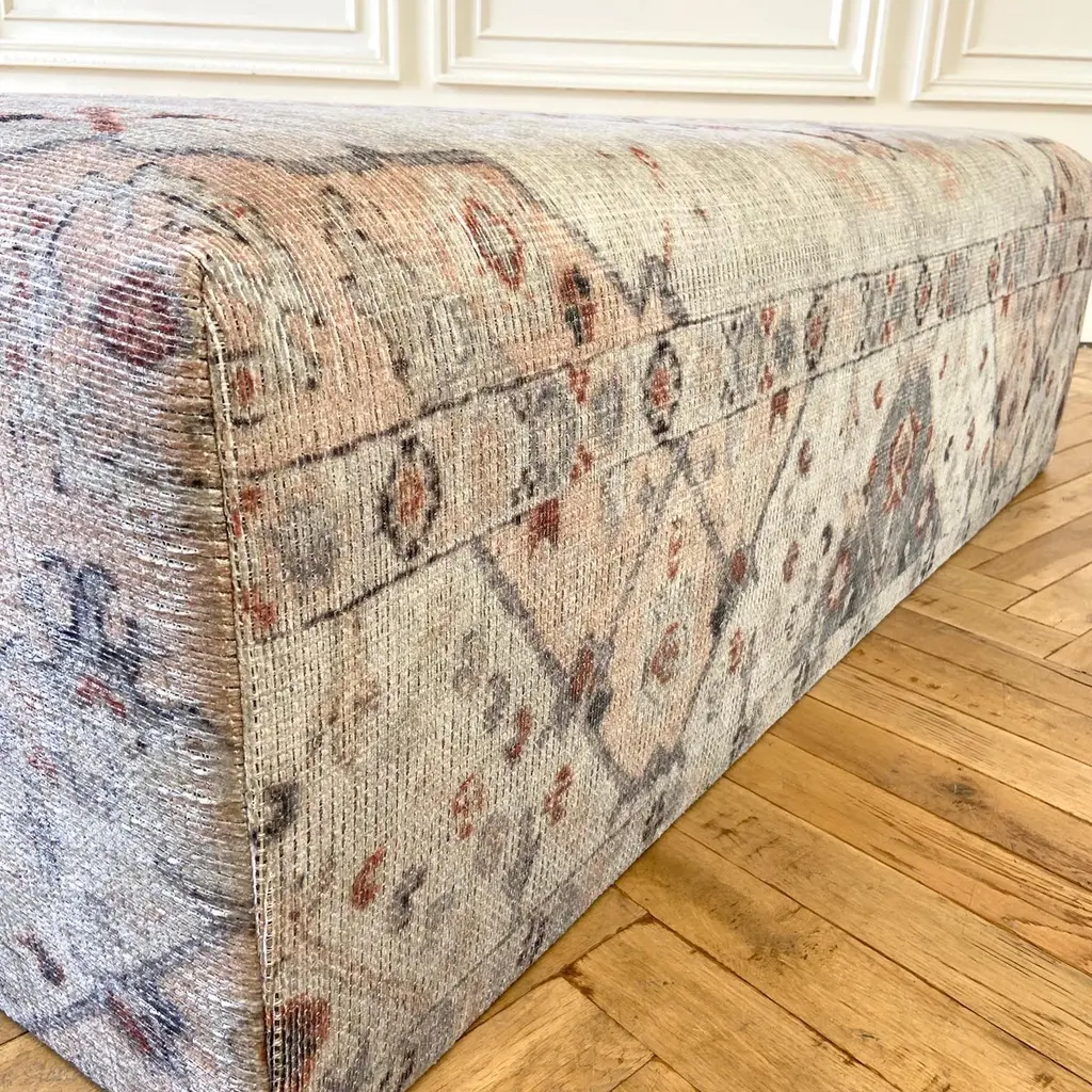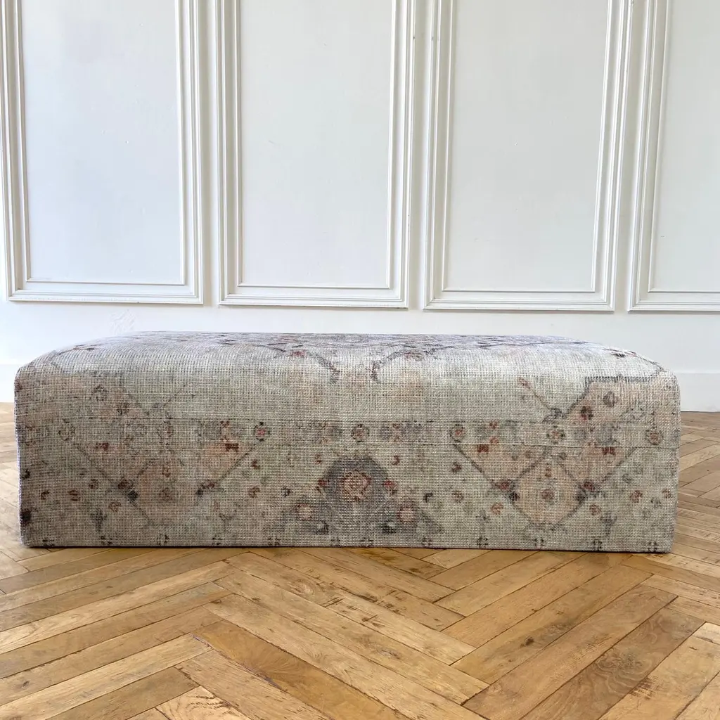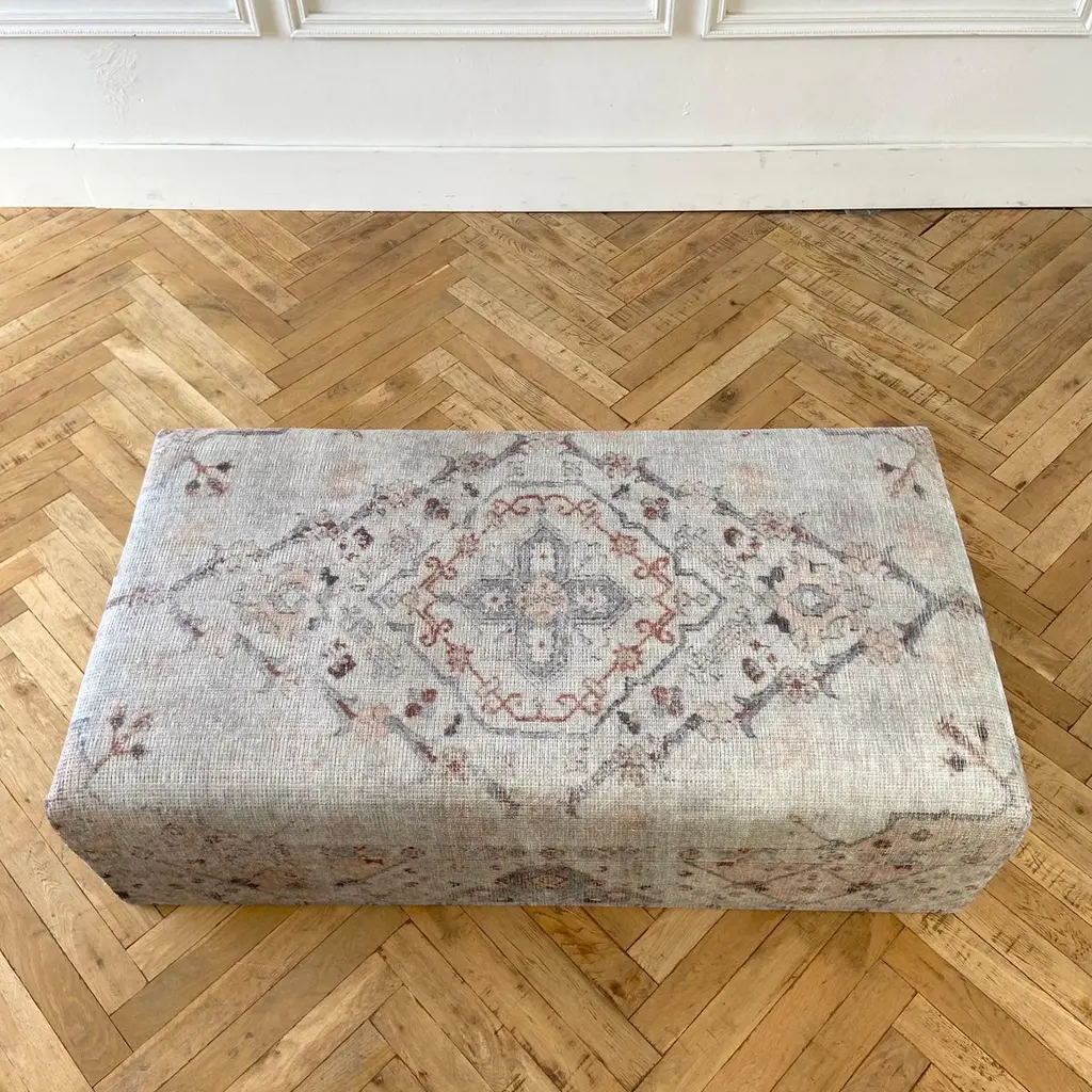 Custom made cube style ottoman. This can be remade and ordered to any size. The rug we are using is a new "vintage look" turkish flat weave style with nano technology. Meaning this can be wiped clean easily, it has a stain proof barrier to resist stains. These rugs have also been treated with the "fur-friendly" which is a patented technology that provides natural allergen control. These rugs now give your family some extra protection at home from any allergens from dust and pets. Measures: Cocktail ottoman shown 56” W x 30” D x 17” HColors: Blue, gray, rust, apricot, taupe.