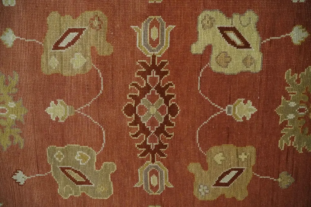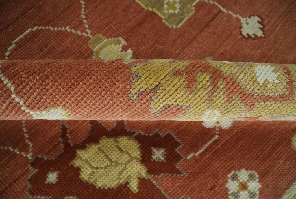 This Rust, Ivory, and Beige Hand hand-knotted traditional Oushak Wool Area Rug offers timeless sophistication. Hand-knotted by skilled artisans using soft wool, the wool construction provides luxurious softness and comfort with the highest longevity. Featuring a traditional Oushak pattern, the multi-size design adds a unique depth to any room. Hand-Knotted SIZES ARE MADE TO ORDER IN 30-60 DAYS Made with Wool Color: Rust, Ivory, and Beige Made with 30 knots per square inch This specific rug is made in India, in the city of Bhadohi. Bhadohi is one of the biggest rug manufacturing cities. Carpet weaving in the region dates back to the 16th century during the reign of Akbar. The skilled artisans of Bhadohi have been carrying the tradition of rug-making for centuries. USERS GUIDE Avoid prolonged moisture Vacuum regularly and/or shake to remove dust Do not pull any loose threads. Use scissors to simply cut the ends The blot spills immediately with a white cloth. Harsh chemicals may damage or fade the rug Use rug protectors under heavy furniture
