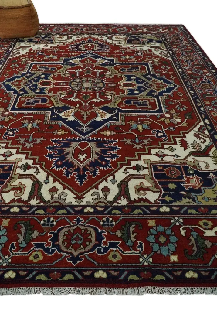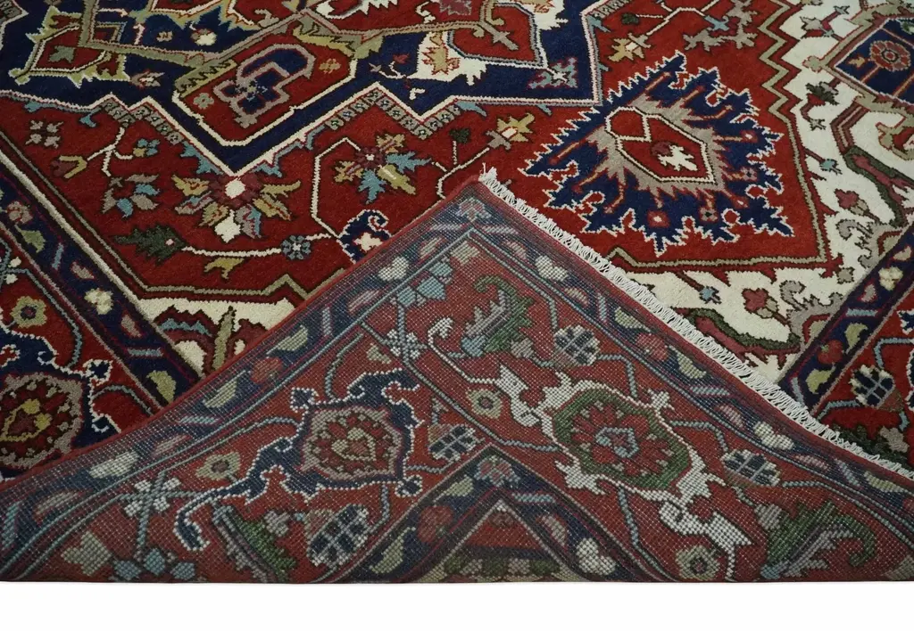 This traditional area rug features a unique Heriz Serapi design, woven with wool in shades of brown, ivory and blue. The multi-size structure gives subtle variety to the room, creating an elegant and timeless atmosphere. Hand-Knotted Made with Wool Color : Brown, Ivory and Blue Made with 30 knots per square inch Sizes are made to order in 30-60 days This specific rug is made in India, in the city of Bhadohi. Bhadohi is one of the biggest rug manufacturing cities. Carpet weaving in the region dates back to the 16th century during the reign of Akbar. The skilled artisans of Bhadohi have been carrying the tradition of rug-making for centuries. USERS GUIDE Avoid prolonged moisture Vacuum regularly and/or shake to remove dust Do not pull any loose threads. Use scissors to simply cut the ends Blot spills immediately with a white cloth. Harsh chemicals may damage or fade the rug Use rug protectors under heavy furniture