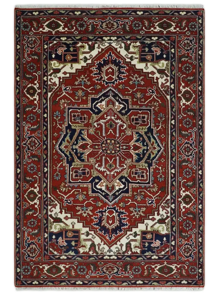 This traditional area rug features a unique Heriz Serapi design, woven with wool in shades of brown, ivory and blue. The multi-size structure gives subtle variety to the room, creating an elegant and timeless atmosphere. Hand-Knotted Made with Wool Color : Brown, Ivory and Blue Made with 30 knots per square inch Sizes are made to order in 30-60 days This specific rug is made in India, in the city of Bhadohi. Bhadohi is one of the biggest rug manufacturing cities. Carpet weaving in the region dates back to the 16th century during the reign of Akbar. The skilled artisans of Bhadohi have been carrying the tradition of rug-making for centuries. USERS GUIDE Avoid prolonged moisture Vacuum regularly and/or shake to remove dust Do not pull any loose threads. Use scissors to simply cut the ends Blot spills immediately with a white cloth. Harsh chemicals may damage or fade the rug Use rug protectors under heavy furniture