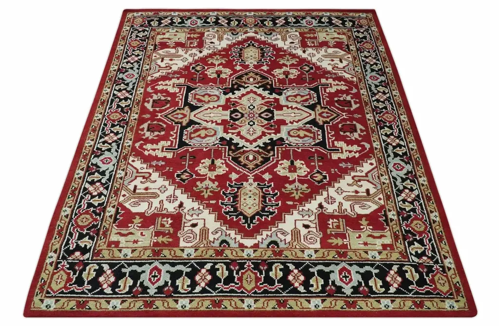 Experience the timeless elegance of our Traditional Heriz Wool Area Rug. Hand-knotted with a stunning medallion design, this rug features a blend of rich Rust, ivory, black, and beige tones. Crafted from high-quality wool, it offers both durability and luxury for any room in your home. Hand-Knotted Made with Wool Made to Order in 30-45 Days Color : Rust, Ivory, Black and Beige This specific rug is made in India, in the city of Bhadohi. Bhadohi is one of the biggest rug manufacturing cities. Carpet weaving in the region dates back to the 16th century during the reign of Akbar. The skilled artisans of Bhadohi have been carrying the tradition of rug-making for centuries. USERS GUIDE Avoid prolonged moisture Vacuum regularly and/or shake to remove dust Do not pull any loose threads. Use scissors to simply cut the ends Blot spills immediately with a white cloth. Harsh chemicals may damage or fade the rug Use rug protectors under heavy furniture