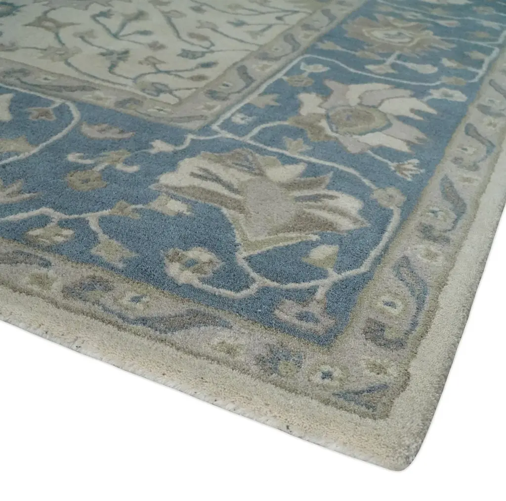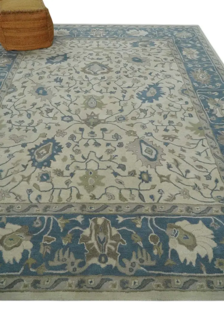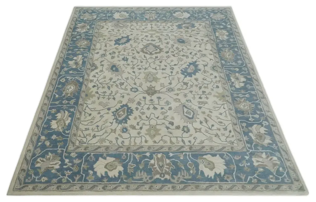 This beautiful modern Oushak rug features a beige and blue antique floral design, custom-made with a unique hand-tufted technique. Perfect for bedrooms, playrooms, and living rooms of any size. Hand-Tufted with Wool Made to Order in 15-30 days Color: Beige and Blue Custom sizes available Since the rugs are hand made they can vary in size by 1-2 inches. Perfect Fit for a modern room, kids, living or bedroom USERS GUIDE Avoid prolonged moisture Vacuum regularly and/or shake to remove dust Do not pull any loose threads. Use scissors to simply cut the ends Blot spills immediately with a white cloth. Harsh chemicals may damage or fade the rug Use rug protectors under heavy furniture