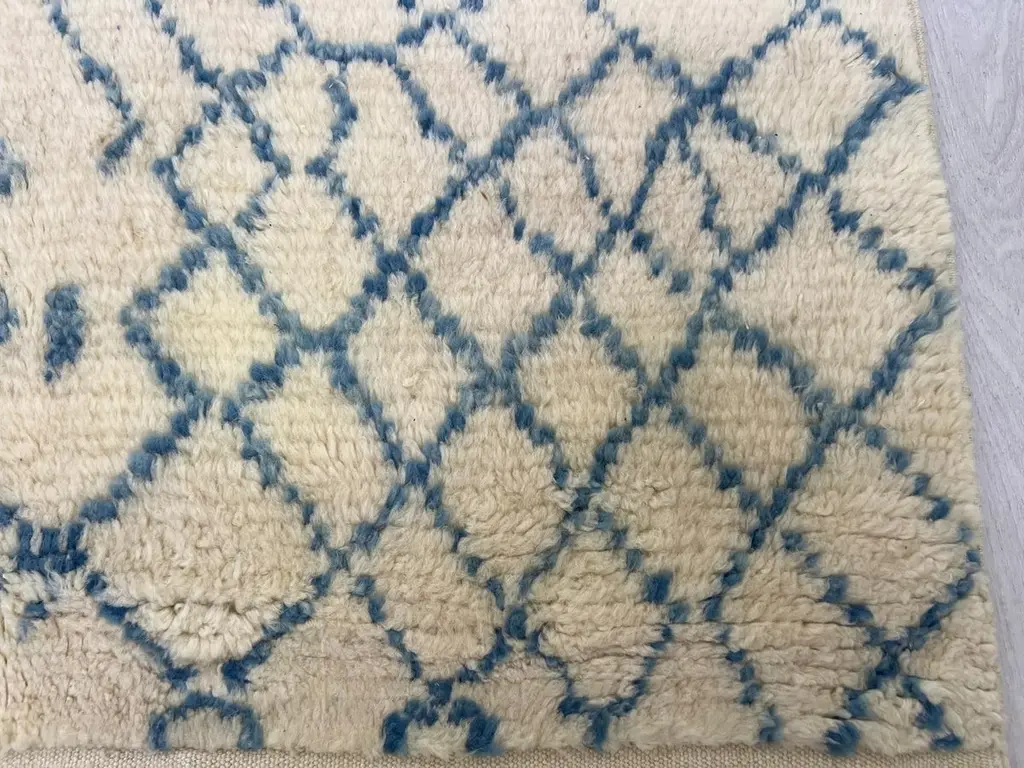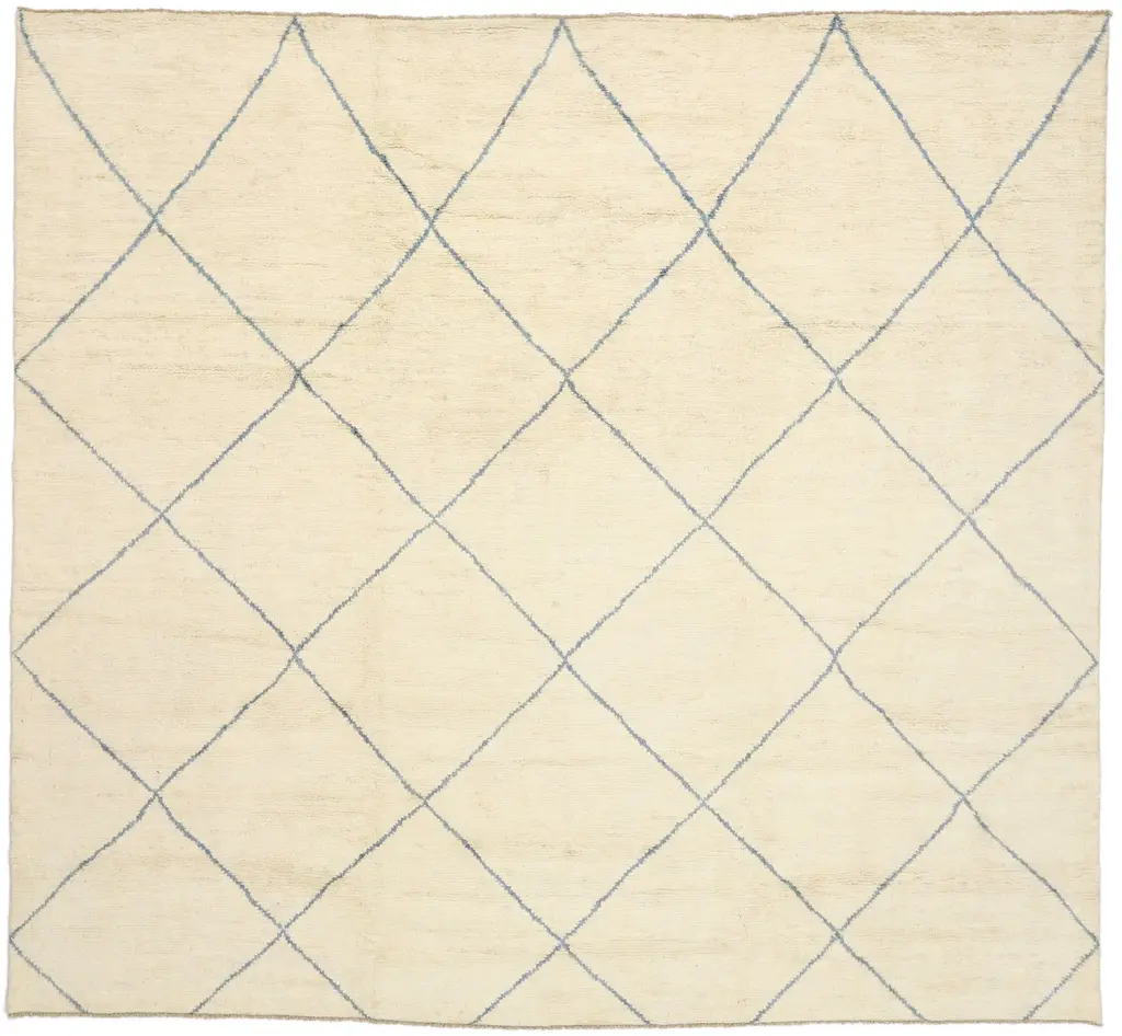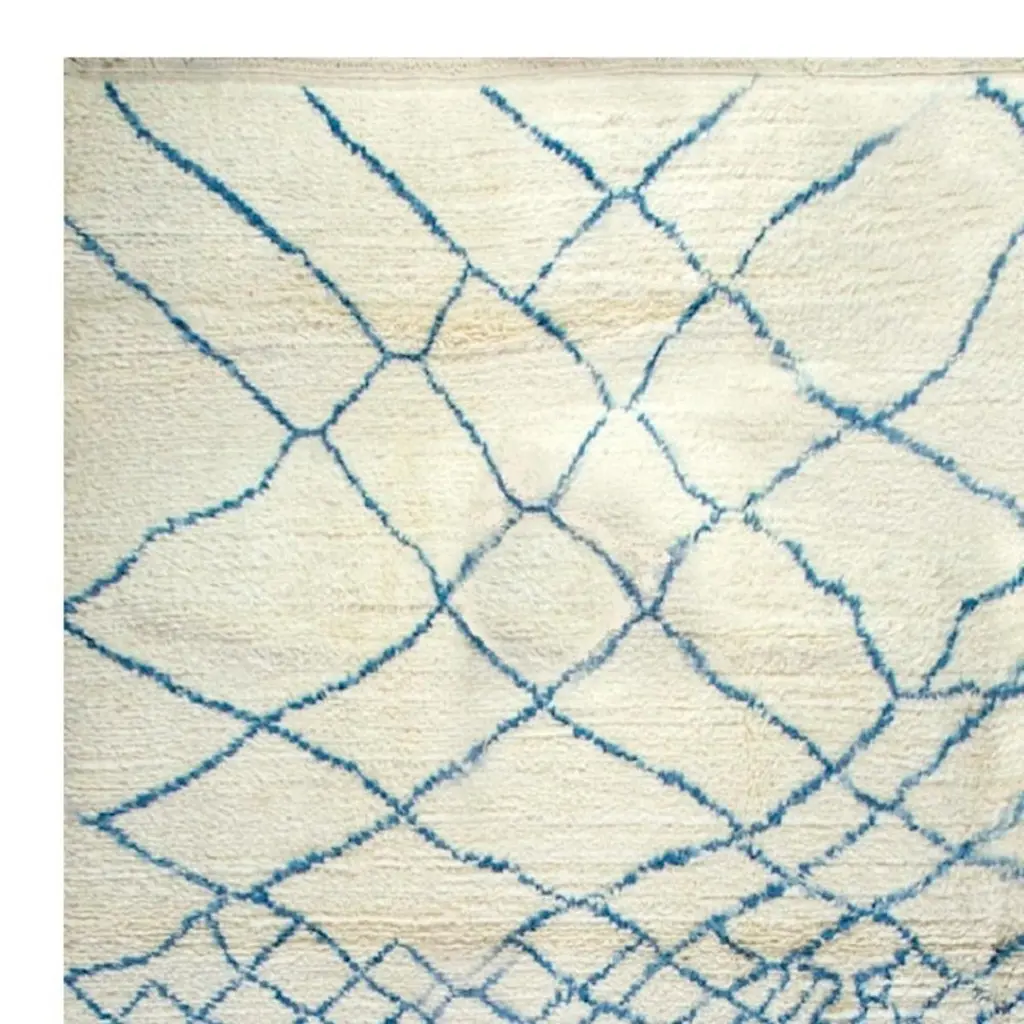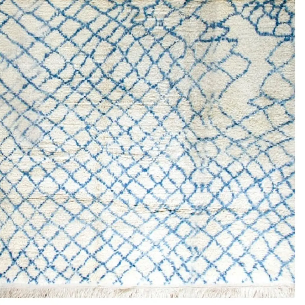A contemporary hand knotted Moroccan rug inspired by the Berber culture in the Atlas mountains, with soft velvety pile, made of hand-spun natural lambswool. It has an overall lattice design changing in size and look from large and billowing at the top to the small and squeezed at the bottom, in blue against a lush cream background.The rug can be custom-produced in any size and color combination requested within usually 5 weeks depending on the size.