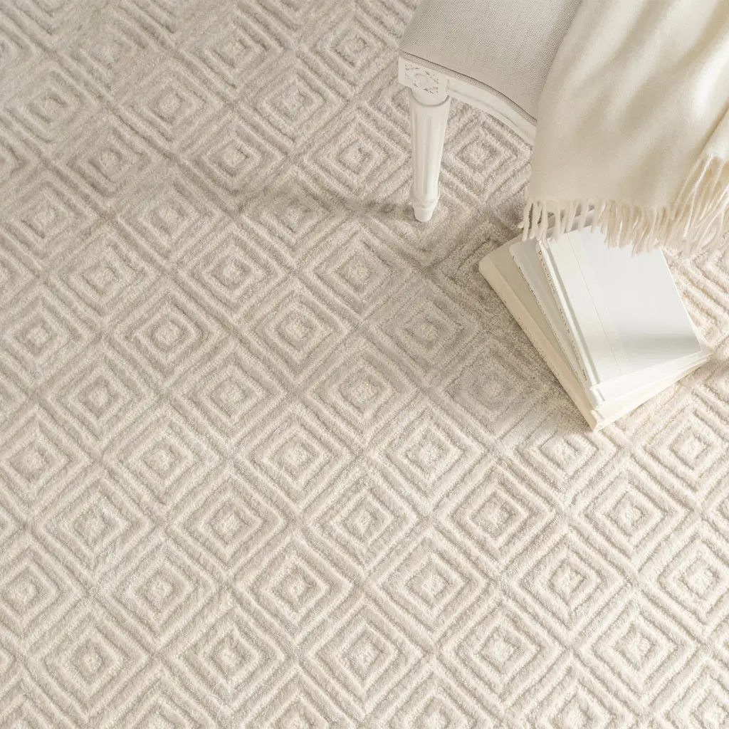 For restrained opulence and chic velvet texture, our cut diamond rug has a cream wool hooked loop base, luxuriously overlaid with dense, viscose, cut pile diamonds for lustrous texture and sheen.