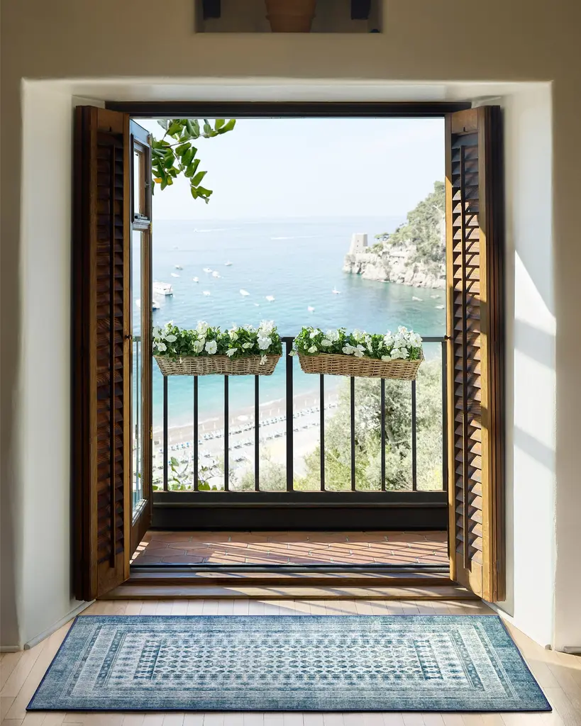Inspired by European caf�� napkins, our Cyrus Ocean and Ivory Rug imparts the distressed feel of artisanal craftsmanship. Its ocean blue background, coupled with ivory motifs, creates a sophisticated aesthetic in any room. Water-resistant, stain-resistant, and machine-washable. Rug colors may vary slightly according to your device and the lighting in your space.