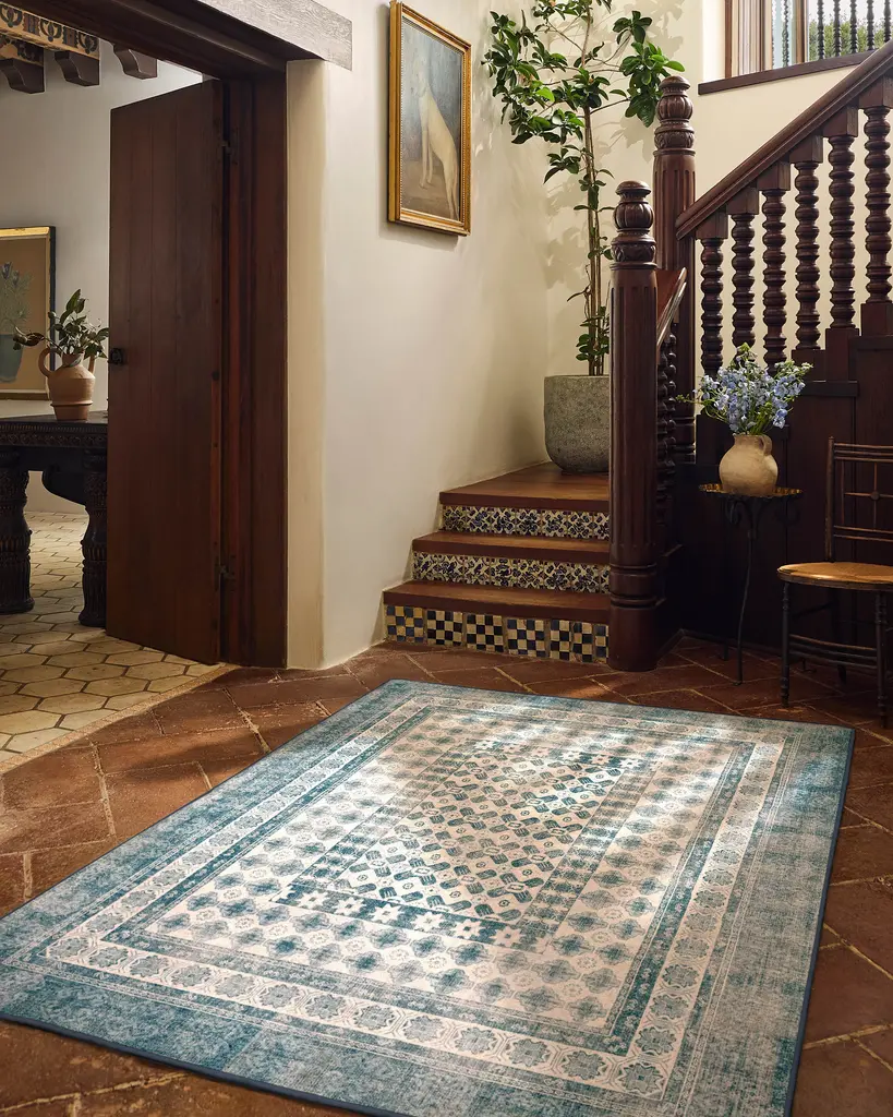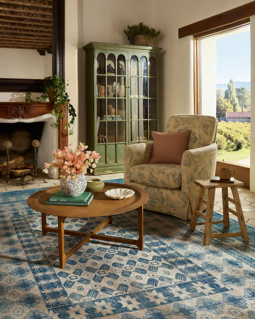 Inspired by European caf�� napkins, our Cyrus Ocean and Ivory Rug imparts the distressed feel of artisanal craftsmanship. Its ocean blue background, coupled with ivory motifs, creates a sophisticated aesthetic in any room. Water-resistant, stain-resistant, and machine-washable. Rug colors may vary slightly according to your device and the lighting in your space.