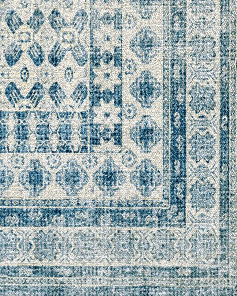 Inspired by European caf�� napkins, our Cyrus Ocean and Ivory Rug imparts the distressed feel of artisanal craftsmanship. Its ocean blue background, coupled with ivory motifs, creates a sophisticated aesthetic in any room. Water-resistant, stain-resistant, and machine-washable. Rug colors may vary slightly according to your device and the lighting in your space.