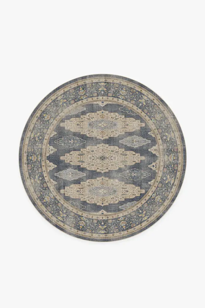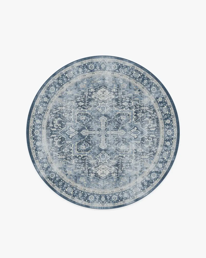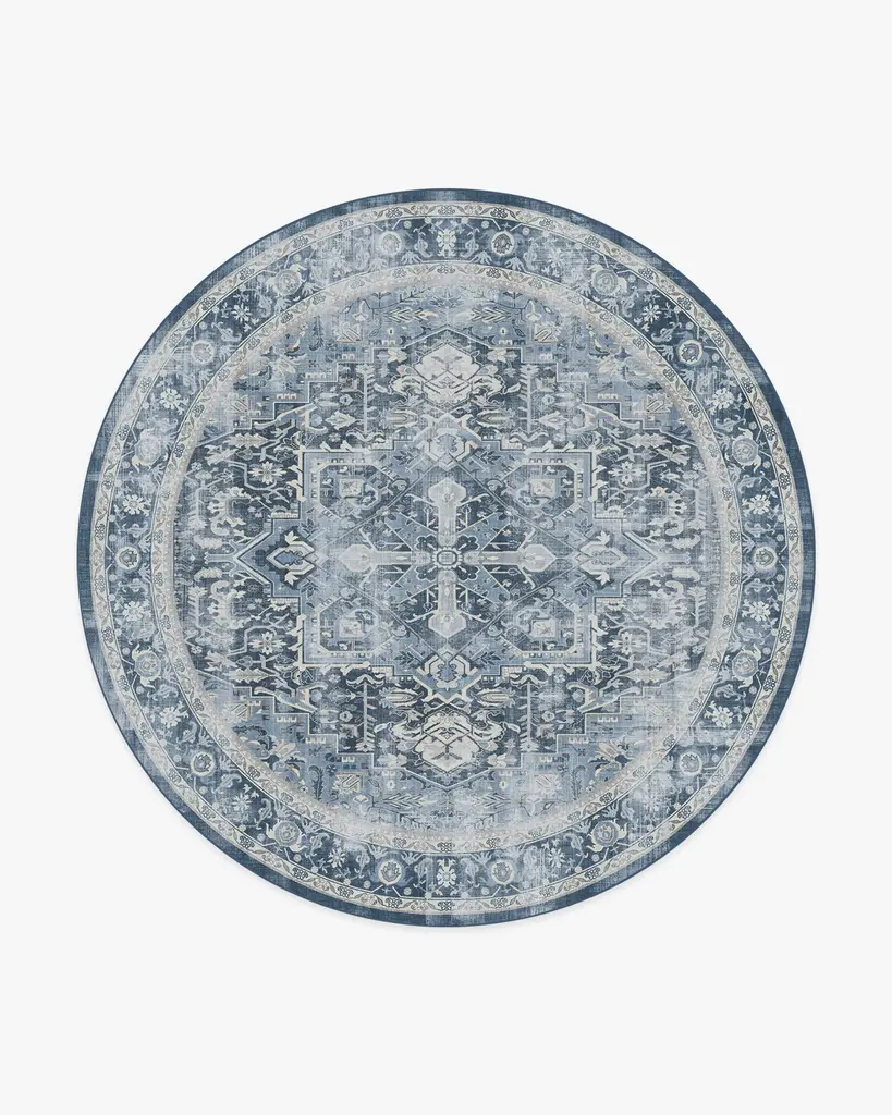 Inspired by European caf�� napkins, our Cyrus Ocean and Ivory Rug imparts the distressed feel of artisanal craftsmanship. Its ocean blue background, coupled with ivory motifs, creates a sophisticated aesthetic in any room. Water-resistant, stain-resistant, and machine-washable. Rug colors may vary slightly according to your device and the lighting in your space.