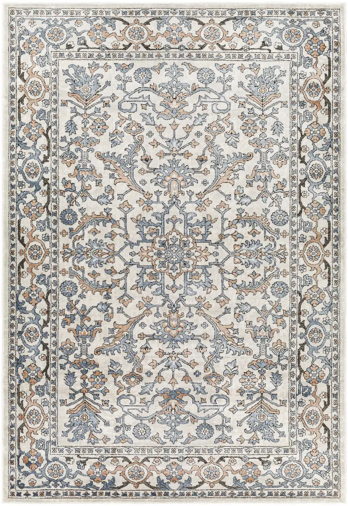 Collection: Dagny Colors: Cream, Blue, Rust, Dark Brown Construction: Machine Woven Material: 75% Polypropylene,25% Polyester Pile: Medium Pile Pile Height: 0.28" Styles: Traditional Made In: Turkey Thickness: 0.31" Price Range: $$$$$ (Most Affordable)