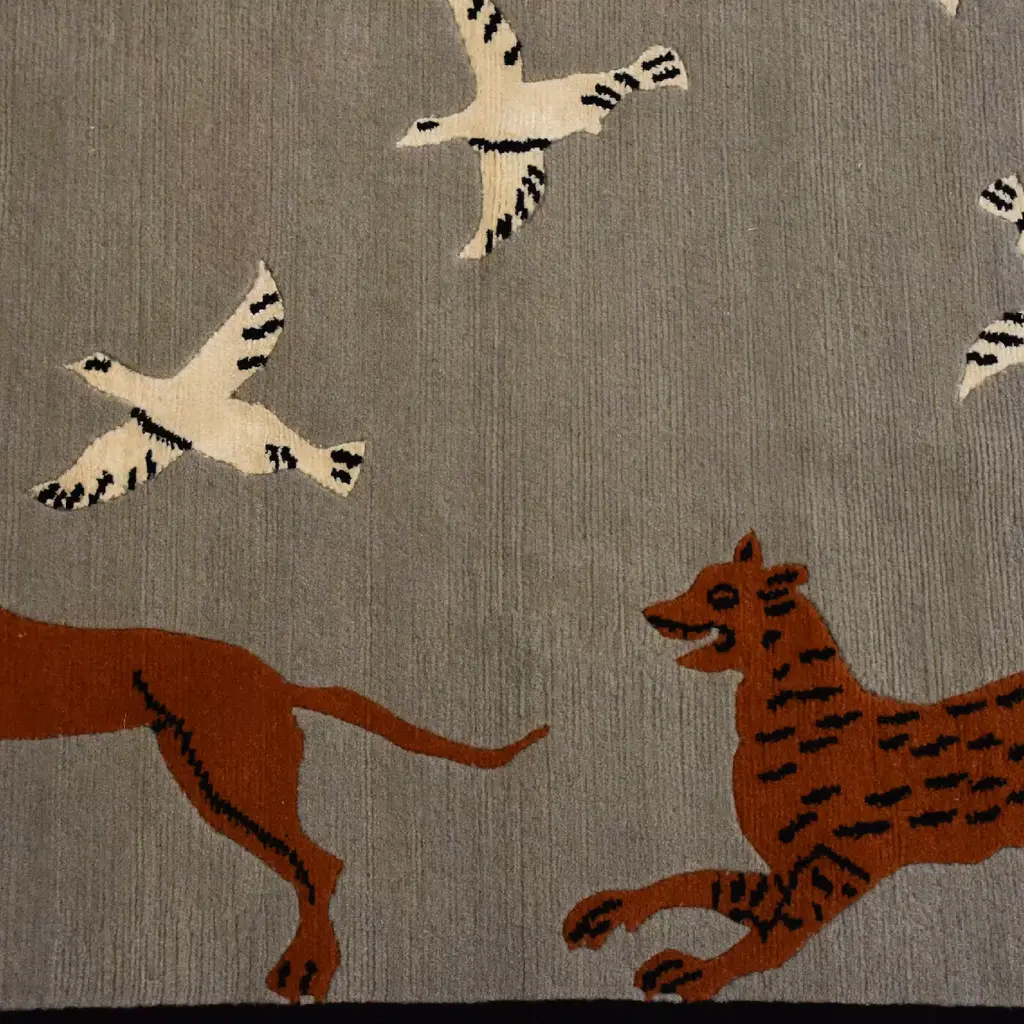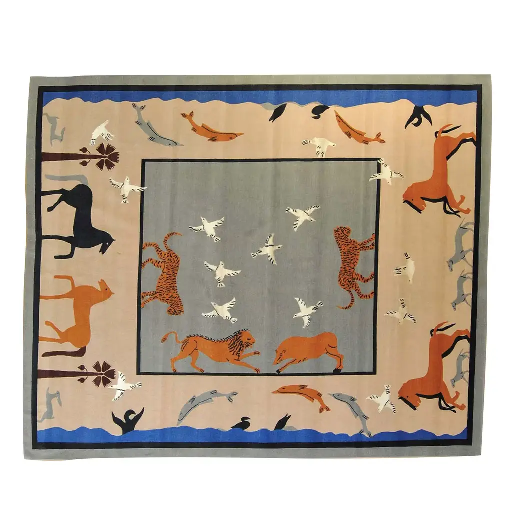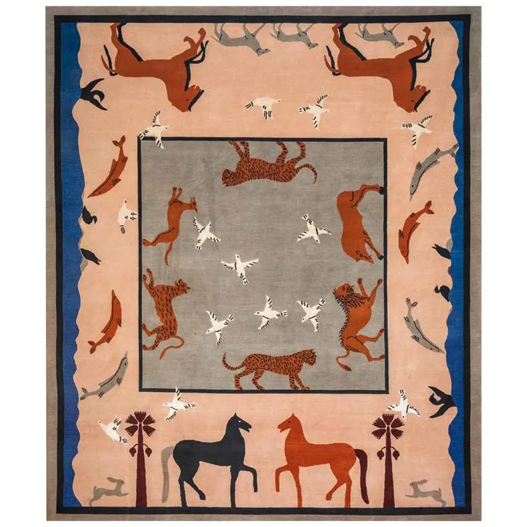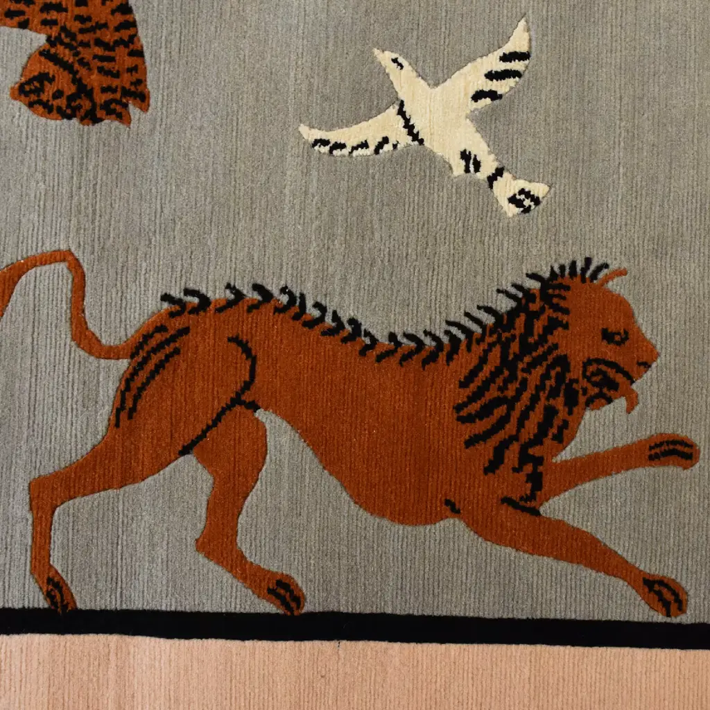 The elements of this exquisite rug, hand-woven in Nepal of Tibetan wool, come together around a central theme: the joyful representations of the animal kingdom as depicted on all Etruscan artifacts. Part of an exclusive collection by Linde Burkhardt, this rug is all played on neutral colors with contrasting edges in cobalt blue and black. Dolphins, horses, and dogs follow in joyful successions on the beige background of the first frame, while two cheetahs, a lion, and a wild boar stand in the light blue square center. The harmonious atmosphere is heightened by a flock of white doves. This piece is currently on show and immediately available at Artemest Galleria New York.