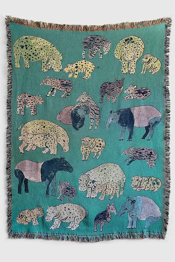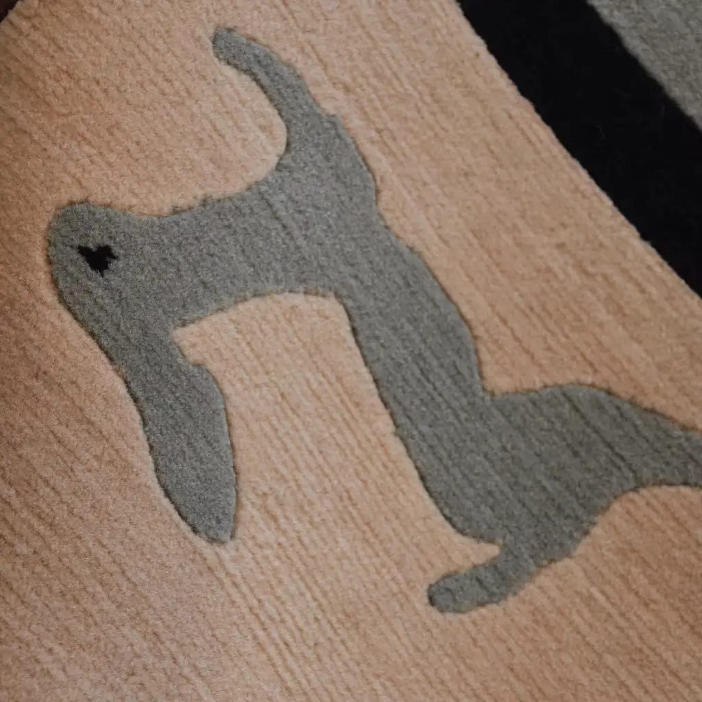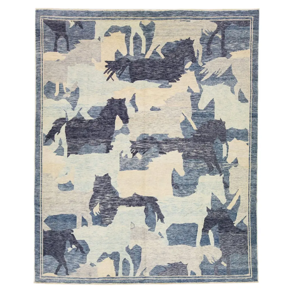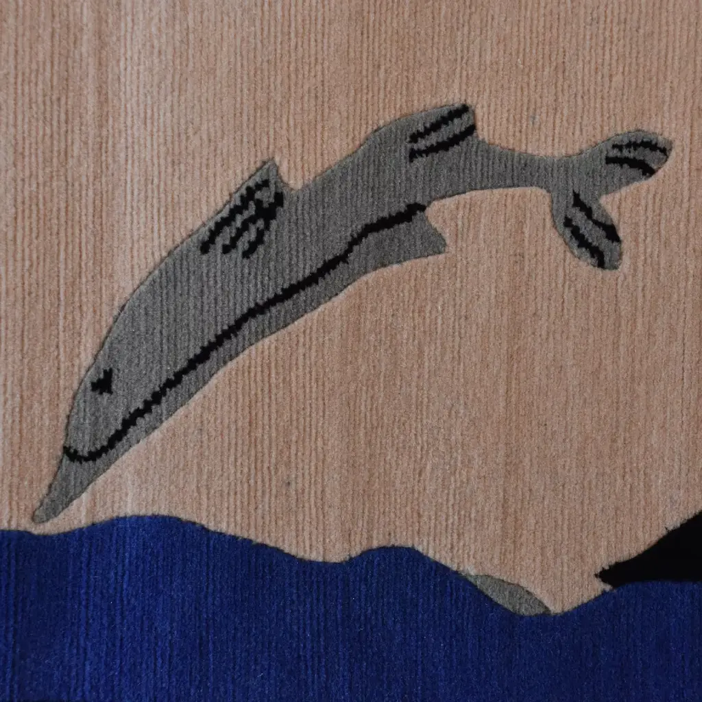 The elements of this exquisite rug, hand-woven in Nepal of Tibetan wool, come together around a central theme: the joyful representations of the animal kingdom as depicted on all Etruscan artifacts. Part of an exclusive collection by Linde Burkhardt, this rug is all played on neutral colors with contrasting edges in cobalt blue and black. Dolphins, horses, and dogs follow in joyful successions on the beige background of the first frame, while two cheetahs, a lion, and a wild boar stand in the light blue square center. The harmonious atmosphere is heightened by a flock of white doves. This piece is currently on show and immediately available at Artemest Galleria New York.