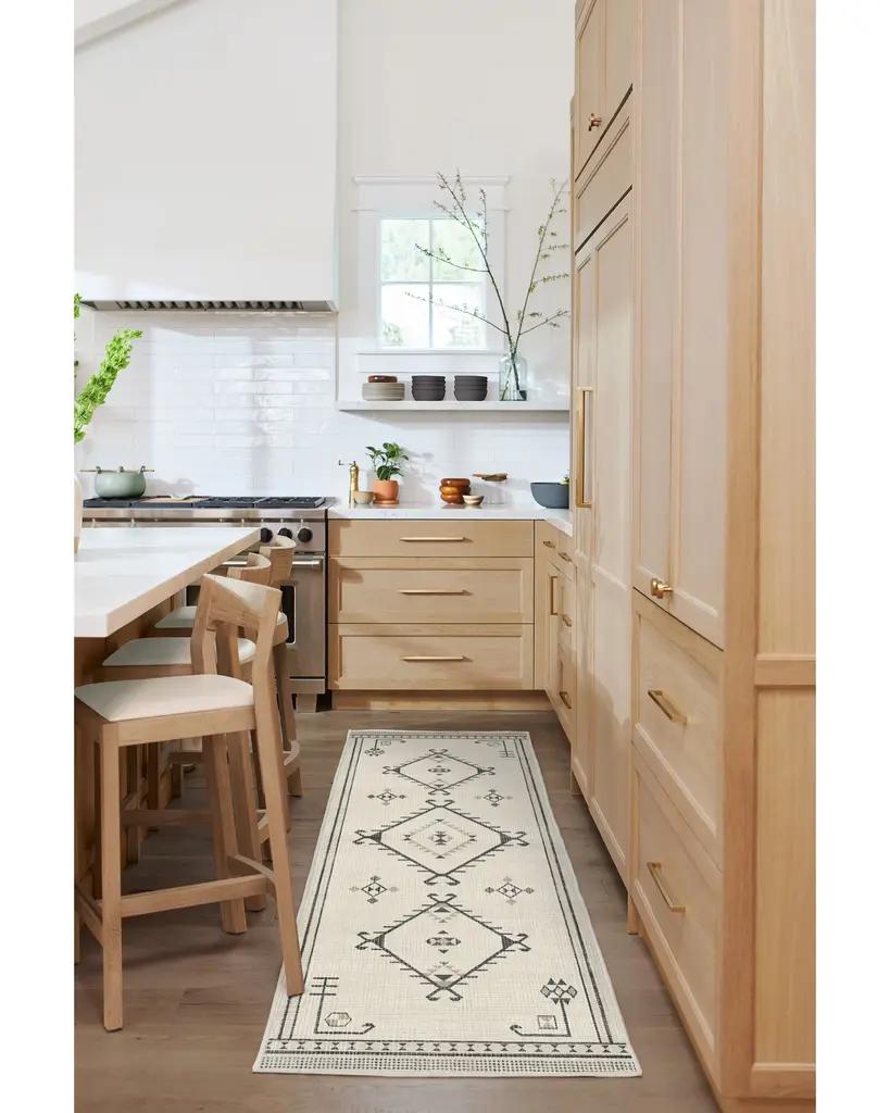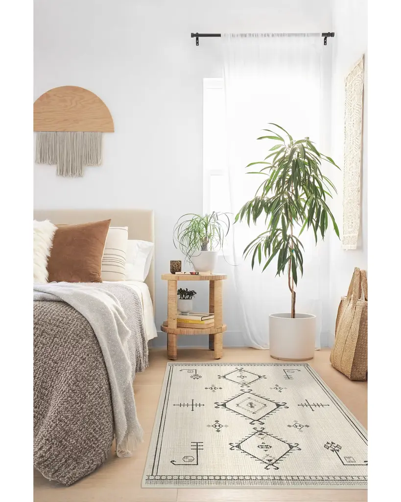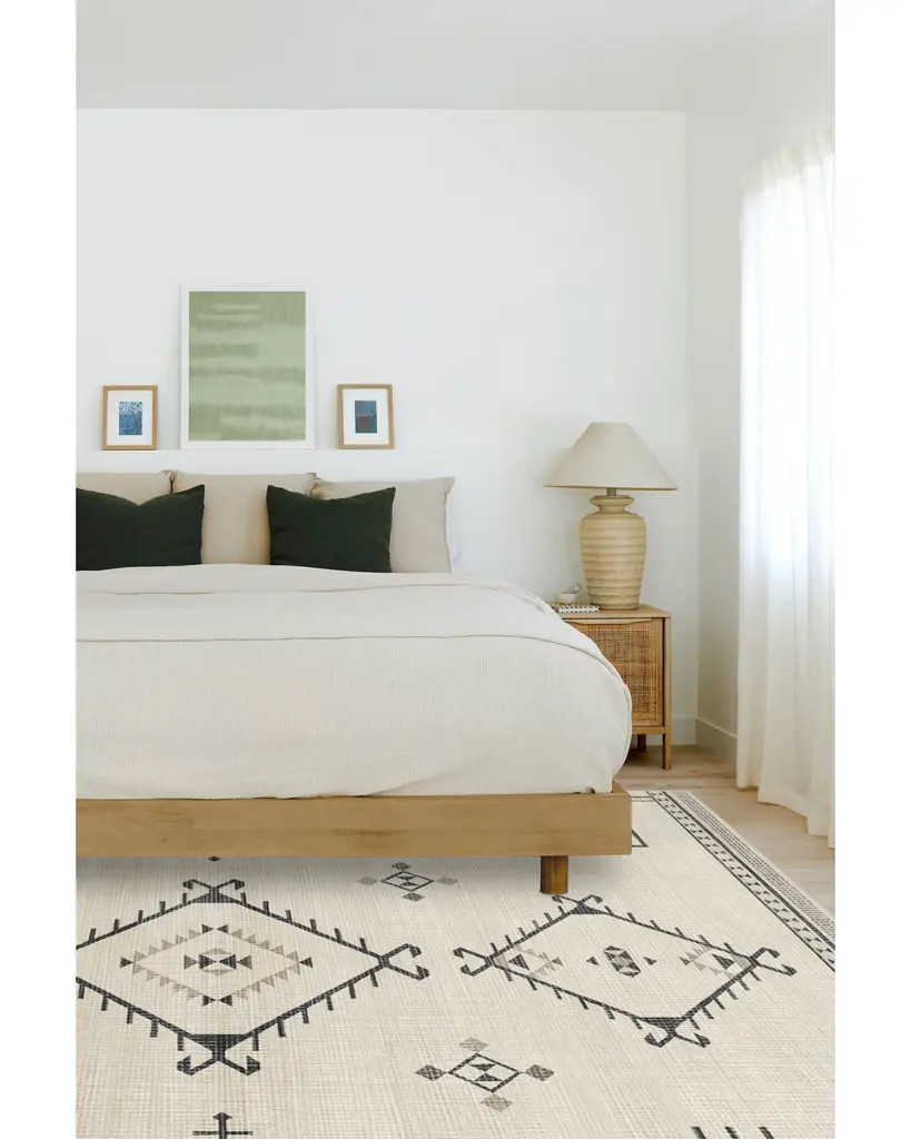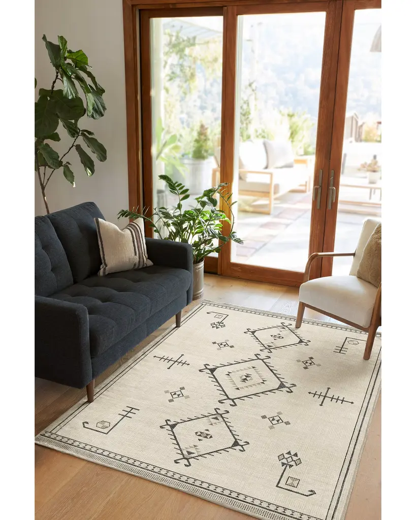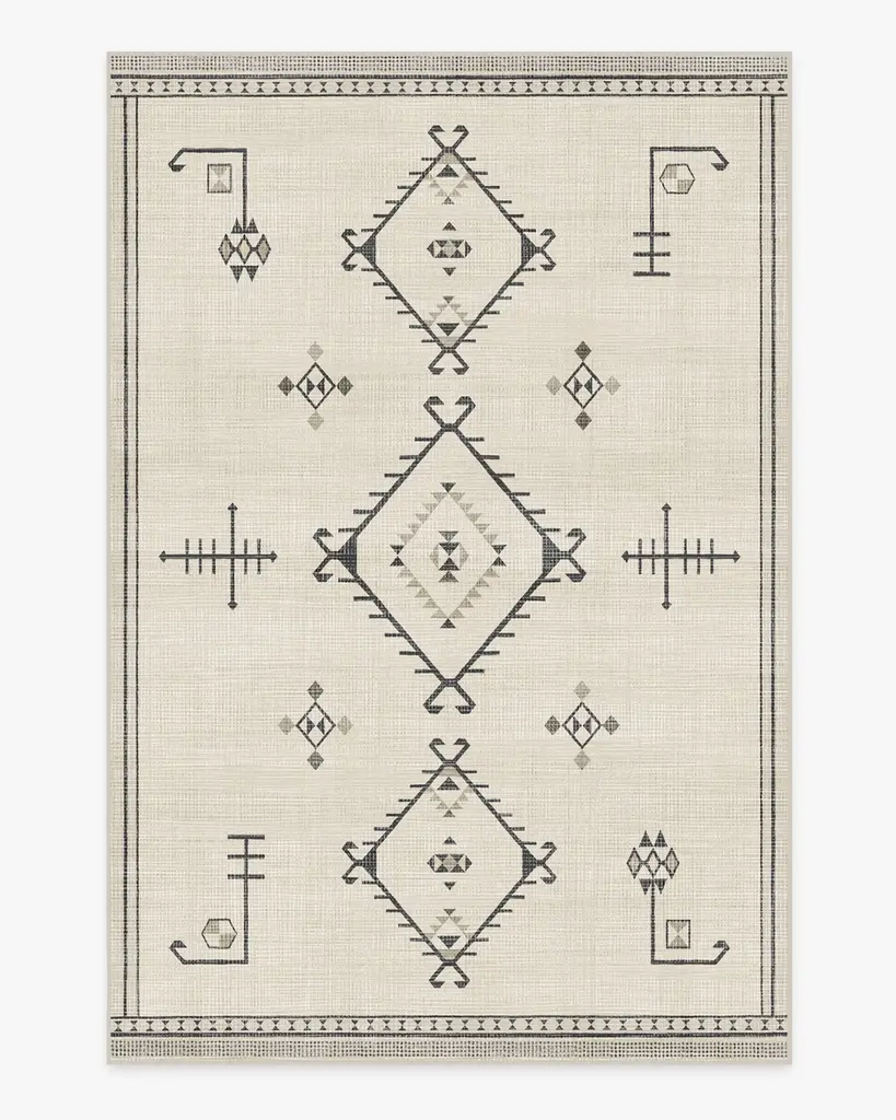 With its symmetry and simplicity, our Damali Black and White Rug brings timeless elegance to a room. This rug features a trio of diamonds set against a striated field, giving it the illusion of texture. Its subdued color palette of grey, cream, and pearl completes the minimalist look that's versatile and modern.