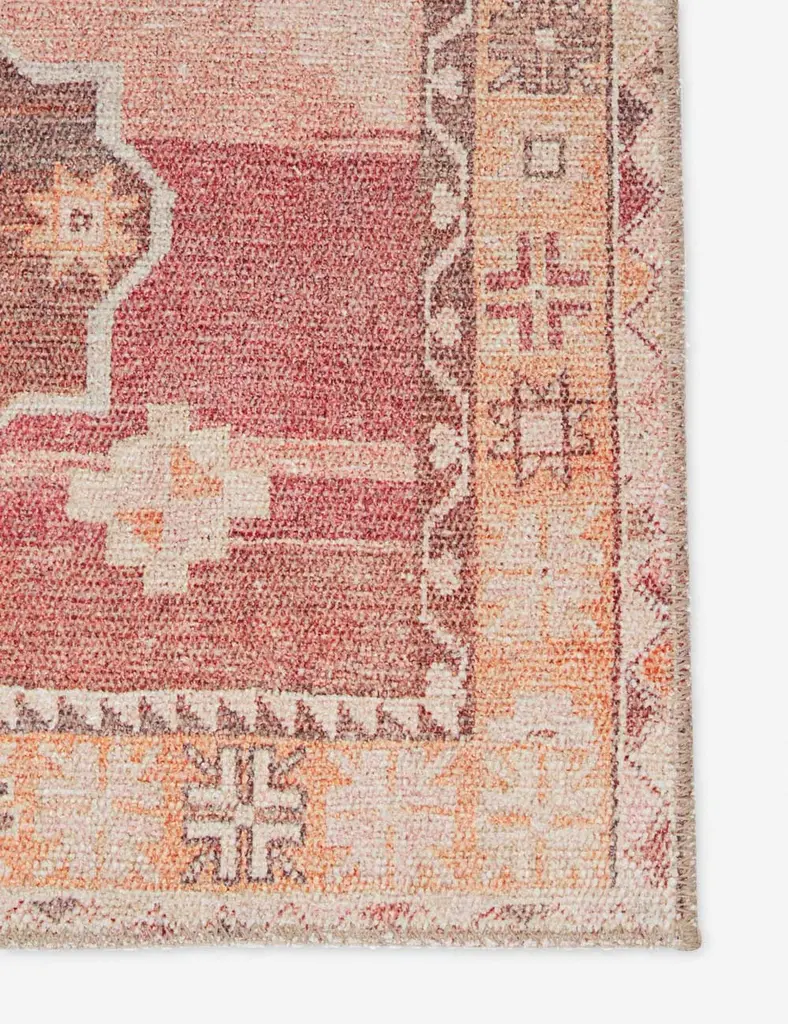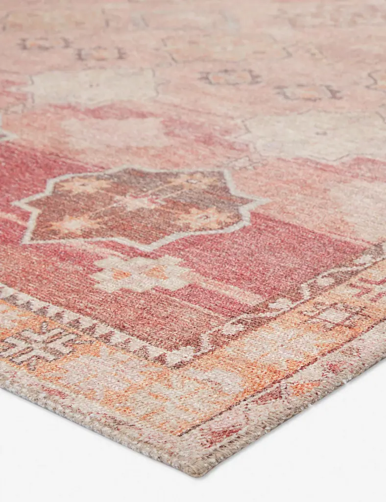 A dusty pink and taupe medallion pattern with a detailed terracotta border cover this area rug. Its printed style offers the timelessness of a classic Turkish motif yet it is the rug's modern construction which makes it a versatile and durable accent.