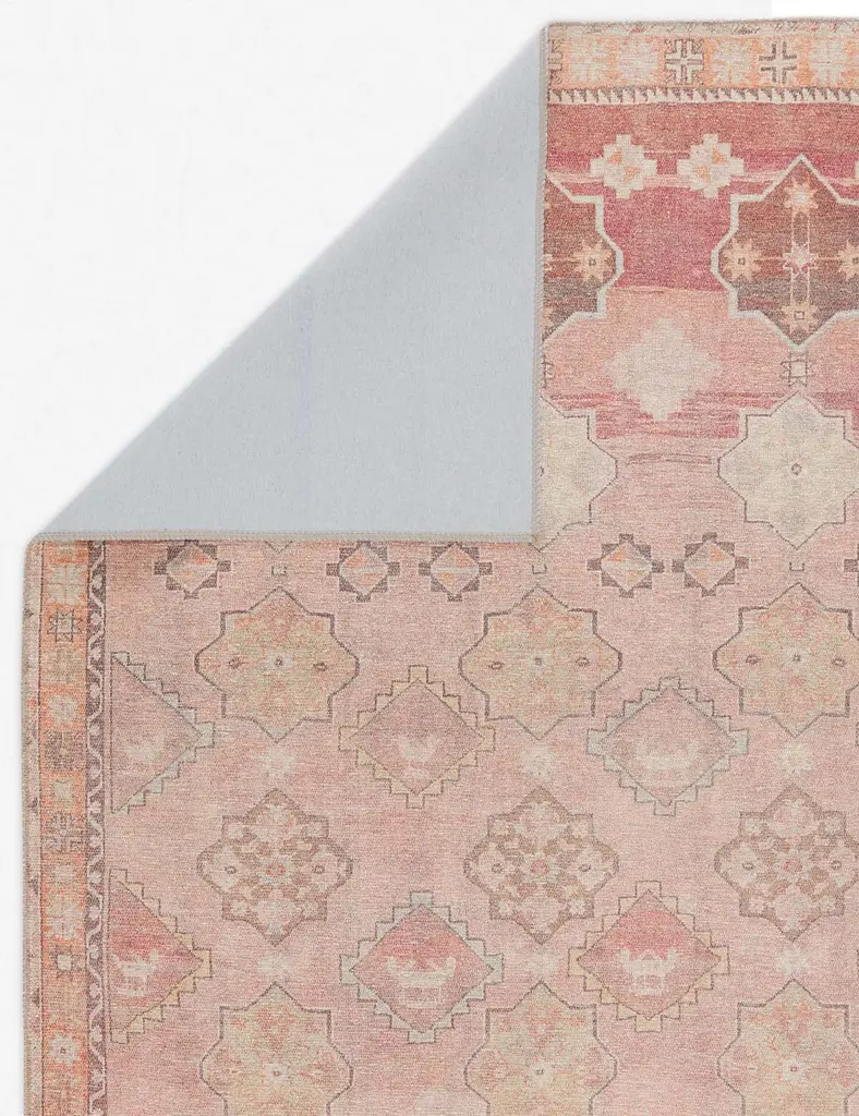 A dusty pink and taupe medallion pattern with a detailed terracotta border cover this area rug. Its printed style offers the timelessness of a classic Turkish motif yet it is the rug's modern construction which makes it a versatile and durable accent.