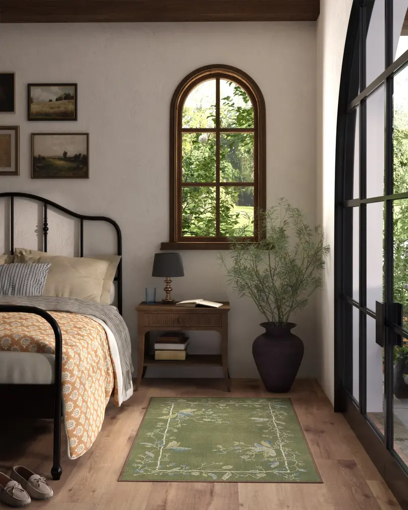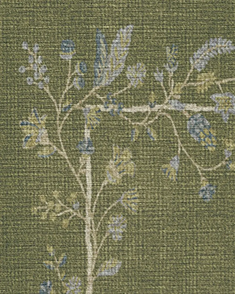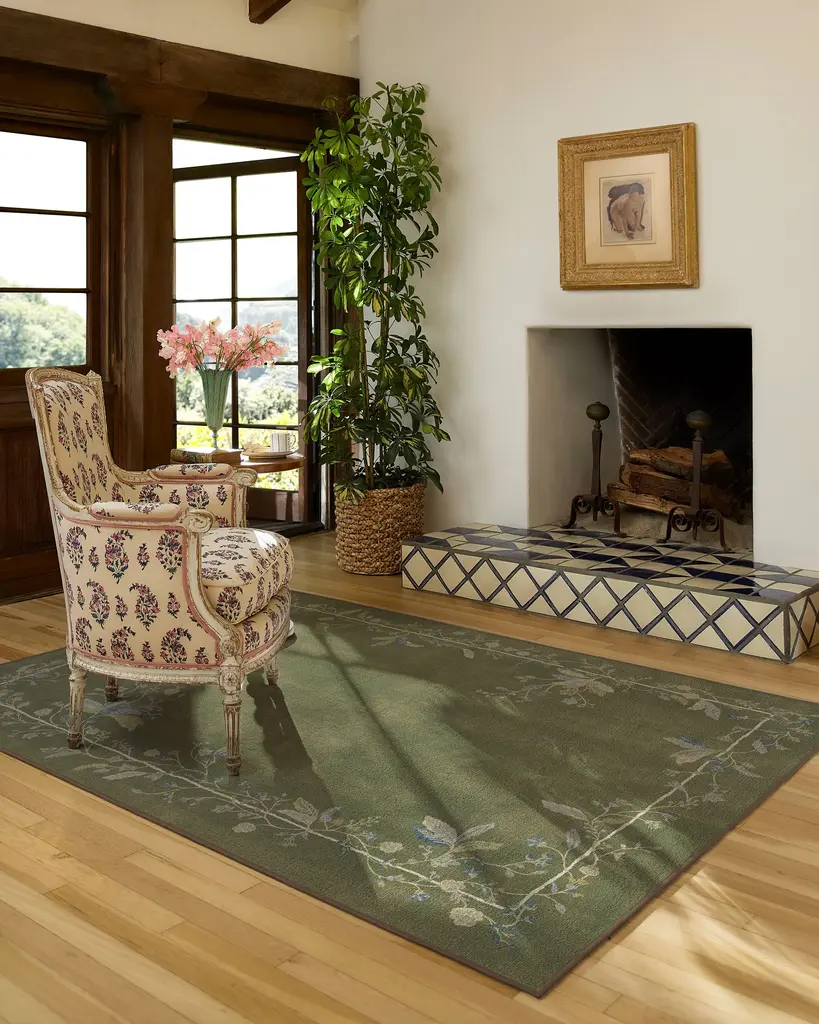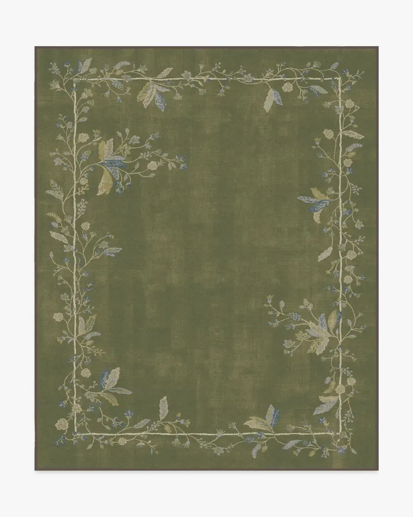 Perfect for the detail-oriented, our Daphne Olive Green Rug features an organic floral motif that gently frames a green field. The deep, fresh hues represent new growth, while the creeping vine elements are reminiscent of floral wallpaper. A palette of olive green, slate and dusty blues, warm taupes, and neutrals enhances the rug's charm. Water-resistant, stain-resistant, and machine-washable. Rug colors may vary slightly according to your device and the lighting in your space.