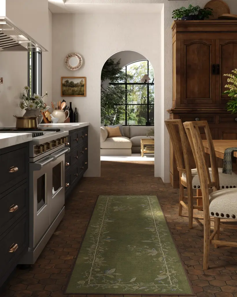 Perfect for the detail-oriented, our Daphne Olive Green Rug features an organic floral motif that gently frames a green field. The deep, fresh hues represent new growth, while the creeping vine elements are reminiscent of floral wallpaper. A palette of olive green, slate and dusty blues, warm taupes, and neutrals enhances the rug's charm. Water-resistant, stain-resistant, and machine-washable. Rug colors may vary slightly according to your device and the lighting in your space.