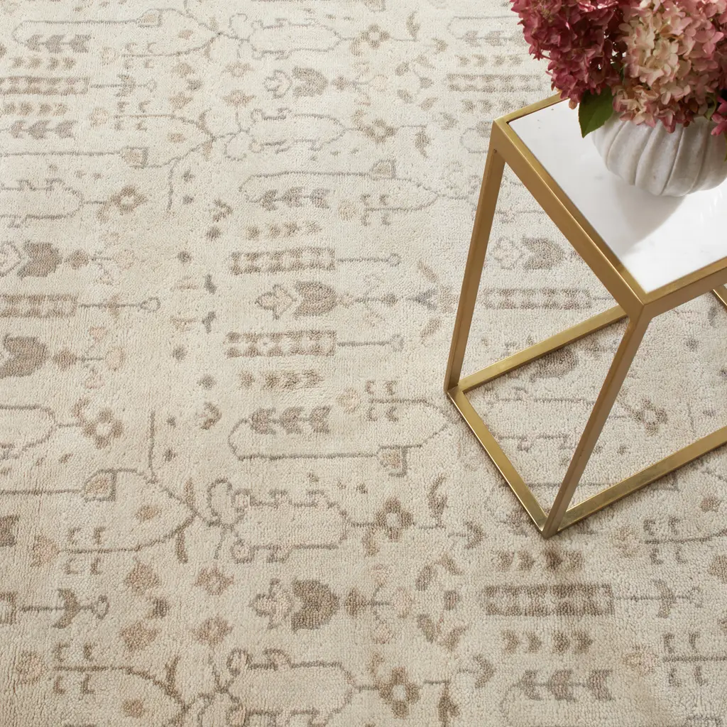 Part of our Masterpiece Collection that draws from the rich heritage of traditional, Turkish Oushak rugs. Woven and hand-knotted by master weavers in India, every detail – from the intricate motifs down to the finest yarn – speaks to the unparalleled quality and artisan craftsmanship of these vintage-inspired rugs. Meet the Dara Cream Hand Knotted Wool Rug—a true standout in our new vintage-inspired collection. This masterpiece is a modern take on a timeless style, with highly intricate geometric designs in sophisticated tones that effortlessly blend into any decor. Its lush, soft texture offers a luxurious feel underfoot, while the unmatched craftsmanship ensures it’s built to last.