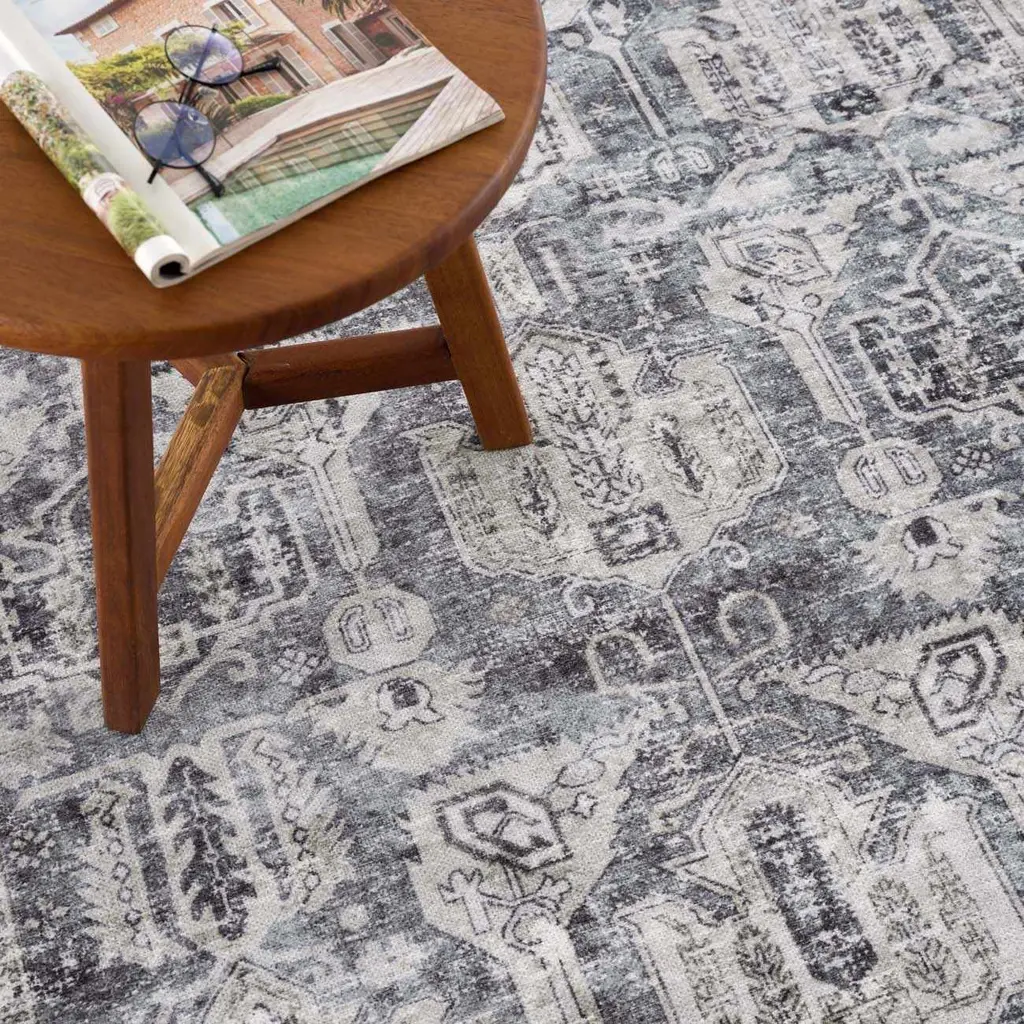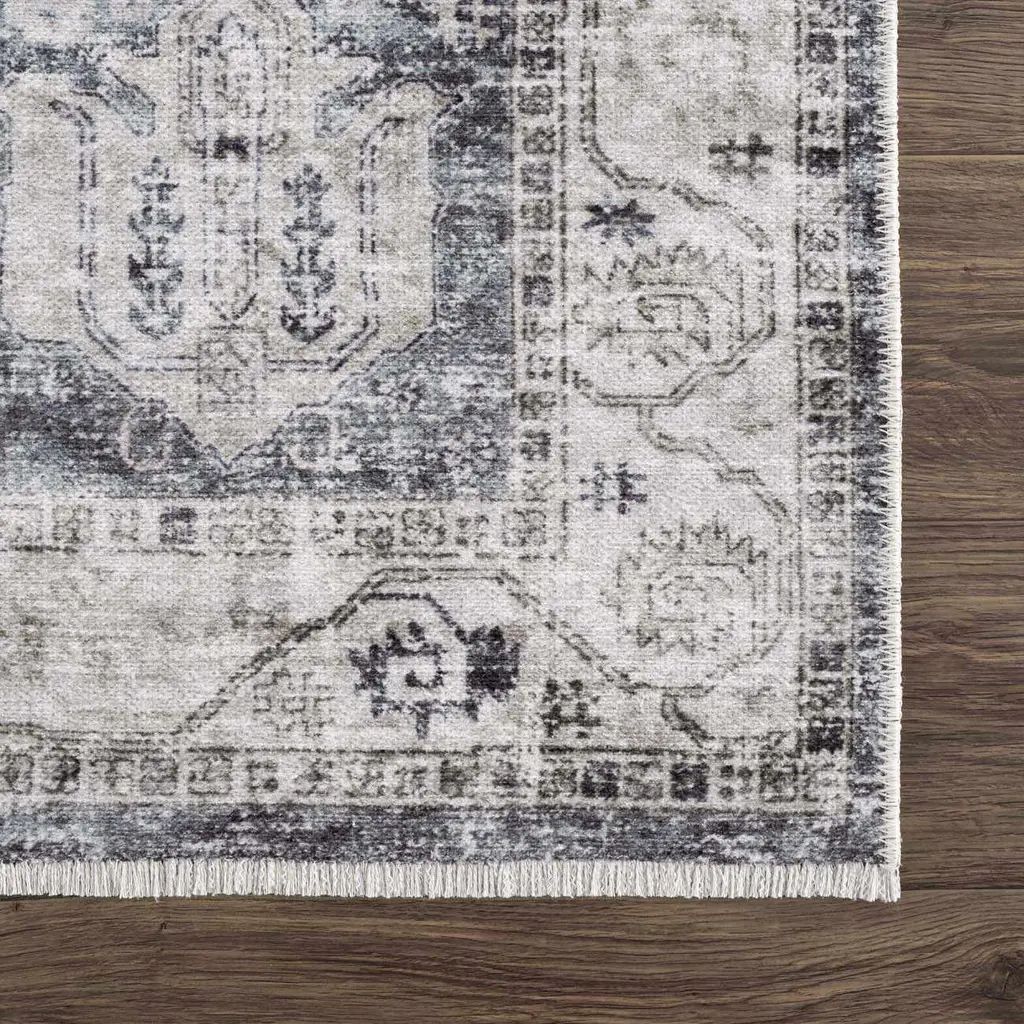 Brand: Hauteloom Collection: Carnig Colors: Off White, Blue, Charcoal, Beige, Gray Construction: Machine Printed Material: 100% Polyester Pile: No Pile Styles: Traditional Backing: Outdoor Latex Machine Washable: Yes Made In: Turkey Thickness: 0.16" Price Range: $$$$$ (Most Affordable)