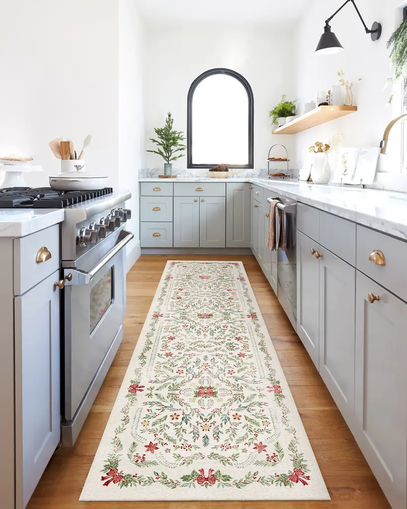 Bring the holiday cheer home. The Deck The Halls Cream Multicolor Rug wraps your space in classic seasonal vibes with a fresh twist. Starting with a creamy base that gently darkens at the edges, it’s decorated with sprigs of green and sage fir, holly berries, and bright red bows—plus little pops of golden yellow that catch the eye. Water-resistant, stain-resistant, and machine-washable. Colors may vary by device and lighting.