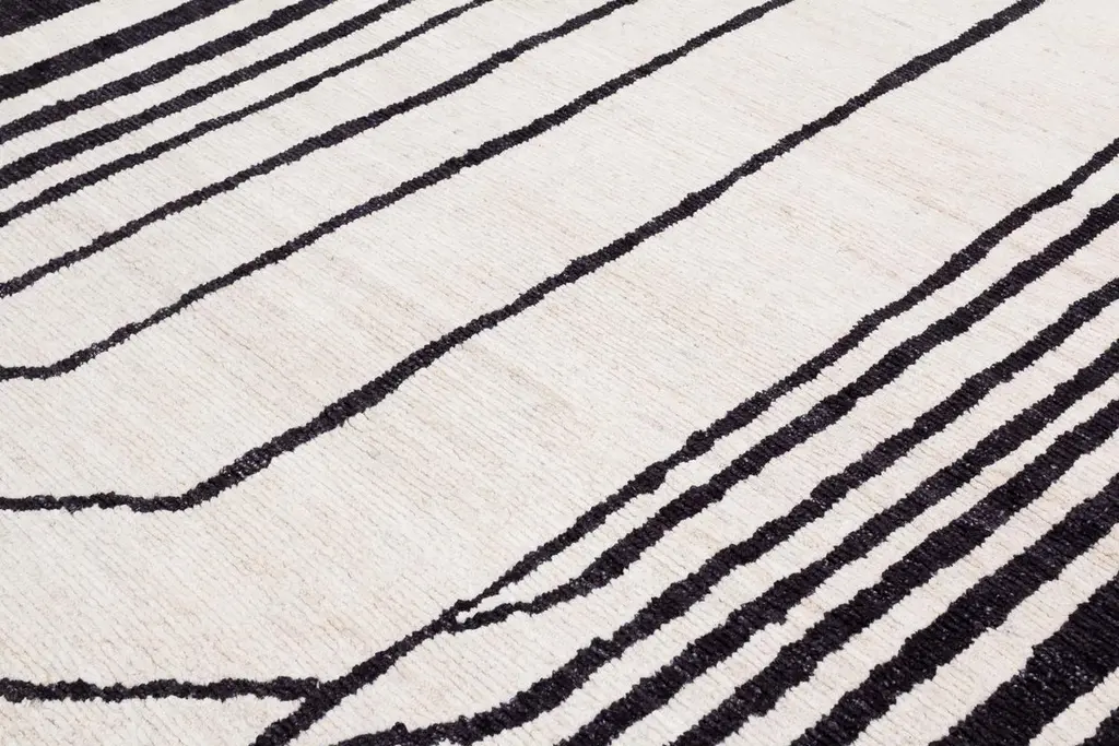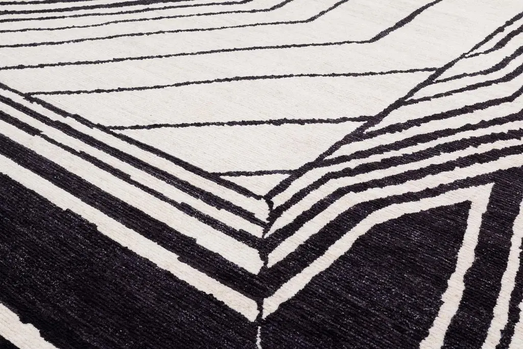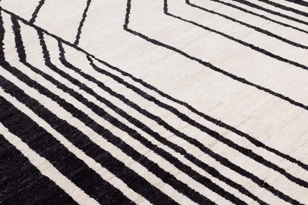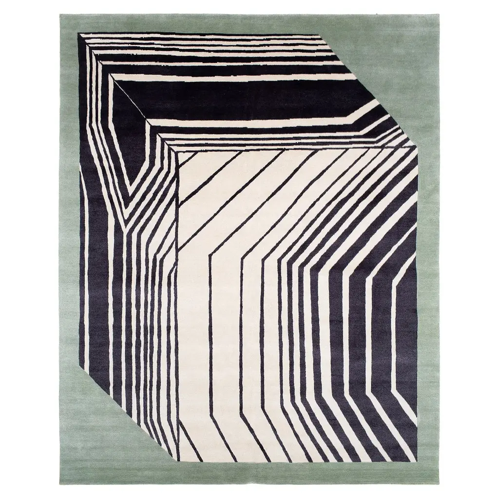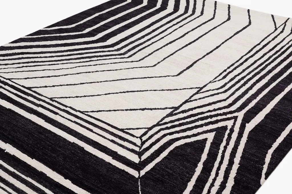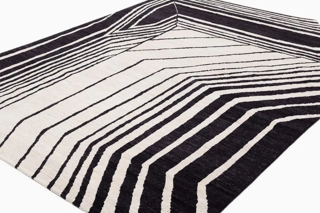 This captivating collection showcases the creative partnership between Joseph Carini and artist, Michelle Weinberg, blending vibrant colors, intricate patterns, and exceptional textile artistry. Their shared enthusiasm for dynamic compositions and the rich history of handmade textiles laid the groundwork for this collaboration. Each piece is a handwoven carpet, meticulously crafted in Nepal through bespoke production, ensuring unmatched quality and artistry. This collection celebrates the duo’s passion for color and striking graphics. Each carpet is customizable in size, material, and color to suit individual tastes.“Deco Polygon probes the space-bending properties of pattern. This rug appears to change shape depending upon the vantage point from which it is viewed.” --Michelle WeinbergShown here in a low knot count wool, this irregular 8x10 cut out area rug is artistic and bold. With wonderful texture, graphic black and white lines form a dimensional cube. The shape appears to shift depending on the viewer's vantage point. Hand knotted in our exclusive workshop in Nepal, this rug is a highly durable handmade labor of love. Woven in our Shiva Puri weave with the finest hand processed Himalayan wool. The wool's natural lanolin will come out over time and give it a beautiful patina, softness, and shine. Also available in a variety of materials including, silk, wool, mohair, wild nettle, and a combination. Please reach out for customization.Carini’s design philosophy is heavily influenced by historical contexts and nature, merging his graphic and organic design interests with his considerable knowledge of decorative arts, architecture, and industrial design history. His expertise in exotic natural dyes and hand-processed materials has become a cornerstone of his work.Joseph Carini is known for his innovative approach, constantly experimenting with design concepts and natural materials. He works closely with designers and clients, offering his expertise to help realize their visions while ensuring practical and aesthetic success. His emphasis on quality and longevity means that each carpet is crafted to last a lifetime, using the most environmentally friendly dyes and processes.Since founding Carini in 1997, Joseph Carini has worked with diverse clients, from A-list celebrities to high-end projects. His creations appeal to design aficionados and art collectors who value unique, authentic pieces. Carini’s rugs are more than just decorative items; they are canvases imbued with intention, positive energy, and a soul that brings warmth and life to any space.Dimensions: 8’ (W) x 10’ (L)Materials: Shiva Puri, woolReference #37672