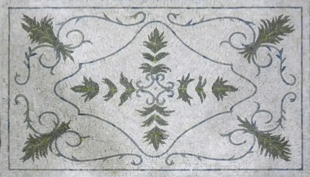 Introducing the Decorative Palmette Rug Mosaic - Omar, a stunning piece that effortlessly brings elegance and sophistication into any space. This exquisite mosaic features a captivating arabesque design showcasing an interplay of light and dark green palmettes, gracefully intertwined with sweeping vines of gray and blue. Set against a warm light gray background, the intricate details of this rug mosaic create a visual oasis that enhances both indoor and outdoor environments.Handcrafted from natural stone, the Omar mosaic is not just a decorative element; it's a testament to artistry and quality. Each piece is carefully selected to ensure that the palette not only resonates with your style but also adds depth and character to your home or pool area. Transform your spaces into serene retreats, where relaxation and aesthetic appeal coexist harmoniously.Whether you're looking to elevate your patio, create a stunning entryway, or add a touch of luxury to a garden pathway, the Decorative Palmette Rug Mosaic - Omar serves as the perfect choice. Its robust construction ensures durability while maintaining the timeless beauty of natural stone. The subtle color variations and intricate patterns draw the eye, providing a sense of movement and life to your floors.Ideal for residential or commercial use, this mosaic is versatile enough to fit various design themes, from classic to contemporary. Use it to define areas within an open space, or as a stand-alone feature that invites admiration and conversation. With the Omar mosaic, you're not just investing in a rug; you're enhancing your lifestyle with a piece that reflects your taste and appreciation for fine design.Elevate your surroundings today with the Decorative Palmette Rug Mosaic - Omar, and let your spaces tell a story of elegance, craftsmanship, and beauty. Enjoy a stylish tile floor that is sure to impress and inspire for years to come.