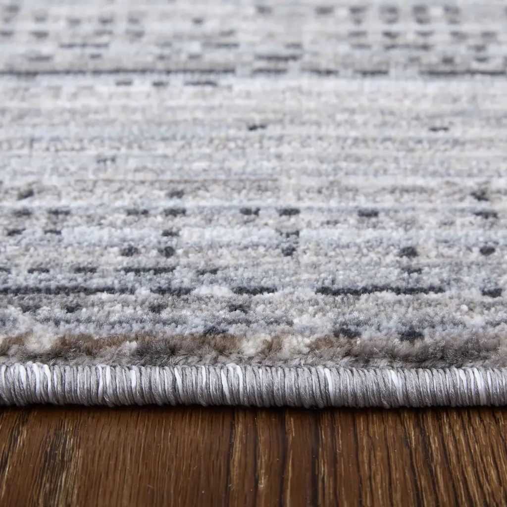 Collection: Deja Colors: Gray, Ivory, Taupe Construction: Machine Made Material: Face: Polypropylene, Polyester / Warp: Cotton Pile: Low Pile Pile Height: 0.47" Styles: Contemporary,Casual Backing: Cotton Made In: Turkey Thickness: 0.47" Price Range: $$$$$ (Affordable)