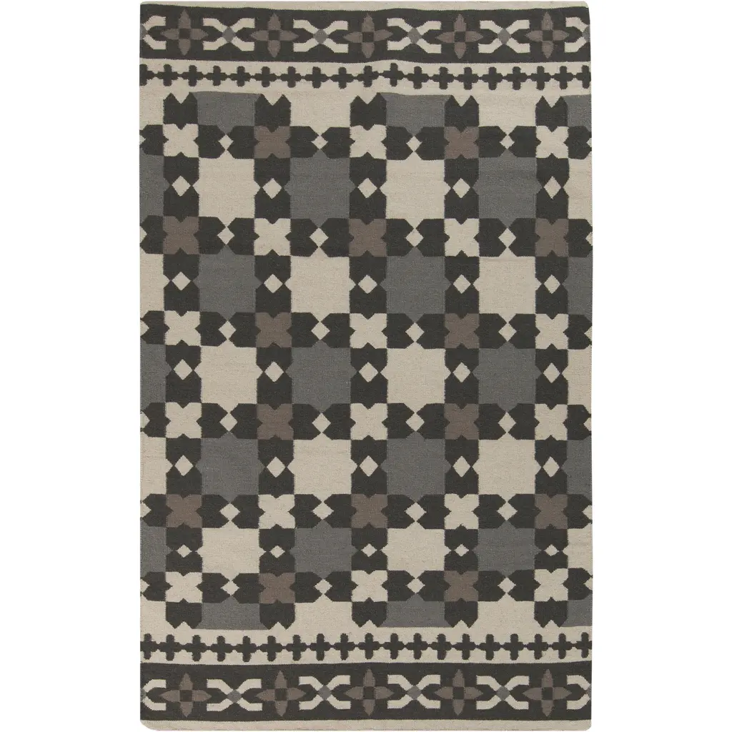 Collection: Delhi Colors: Charcoal, Gray, Ivory Construction: Hand Woven Material: 100% Wool Pile: No Pile Styles: Contemporary Made In: India Thickness: 0.16" Price Range: $$$$$ (Most Affordable)