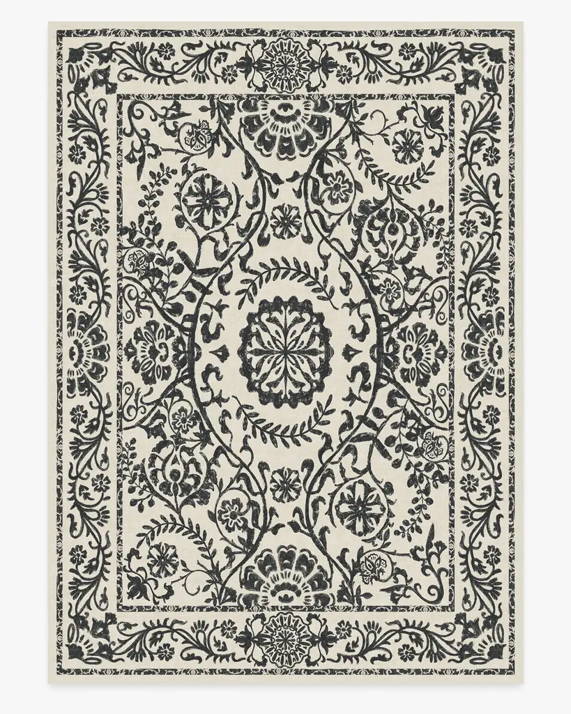 Delphina Black & White Rug takes the floral motif to a whole new level with its beautiful woodblock texture. This rug features a central floral medallion, with a network of vines that stems outward, creating depth and drama and adding instant sophistication to any room.