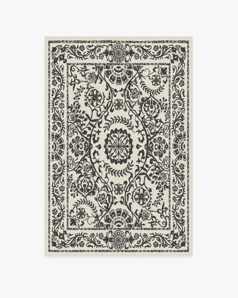 Delphina Black & White Rug takes the floral motif to a whole new level with its beautiful woodblock texture. This rug features a central floral medallion, with a network of vines that stems outward, creating depth and drama and adding instant sophistication to any room.