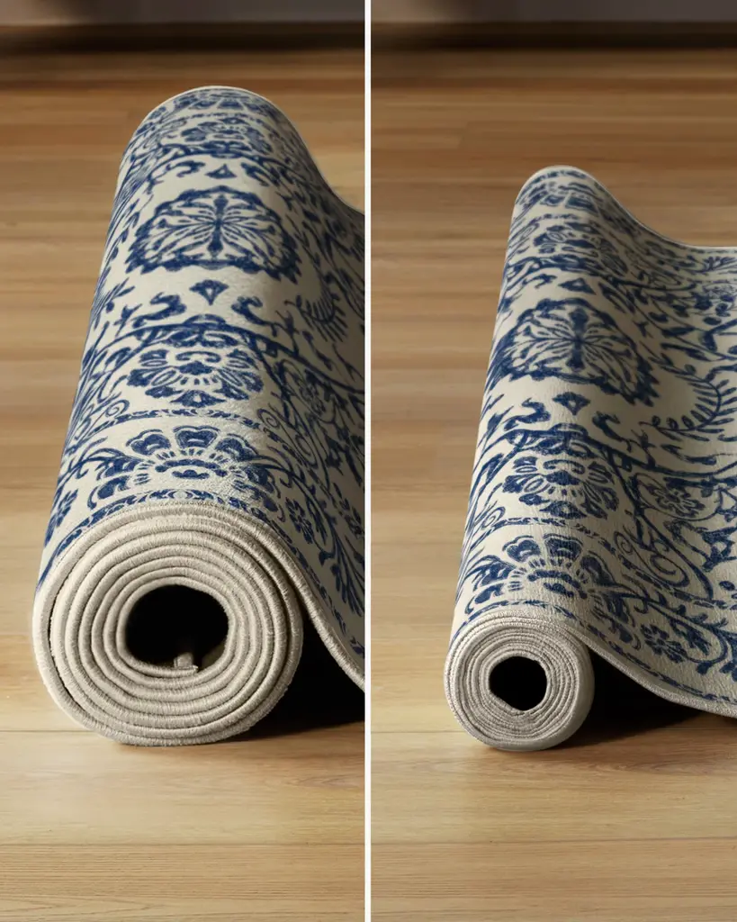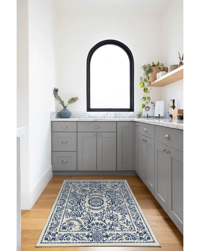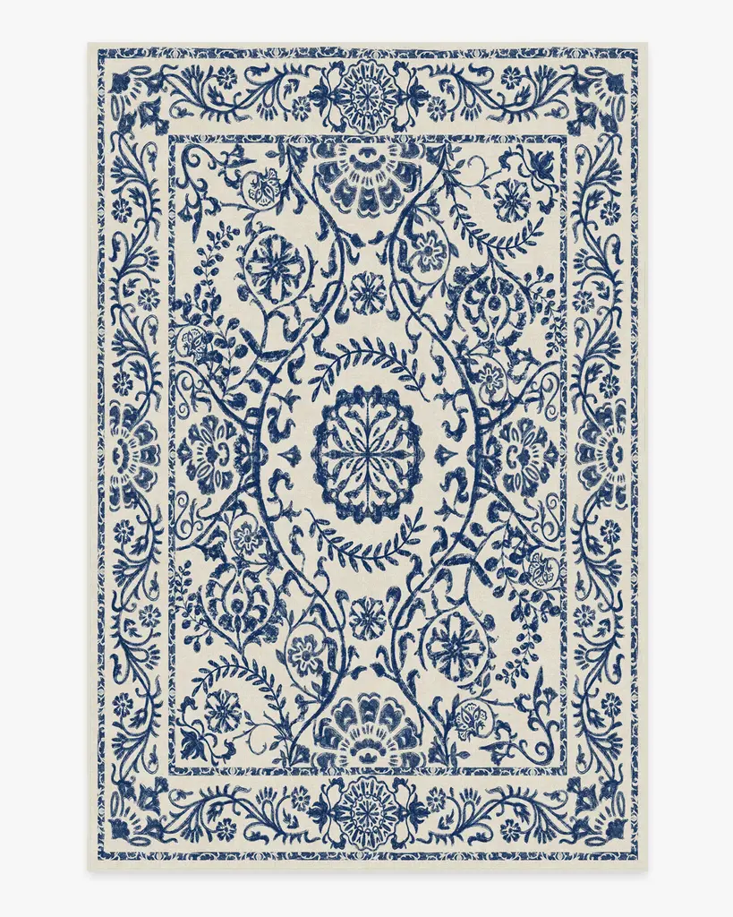 Inspired by the ancient Greek city of Delphi. Our Delphina Delft Blue Rug features a web of intricate floral vines and mimics the uneven texture of traditional woodblock printing. Its bicolor scheme of dark denim blue and pearl white is reminiscent of 17th-century porcelain.
