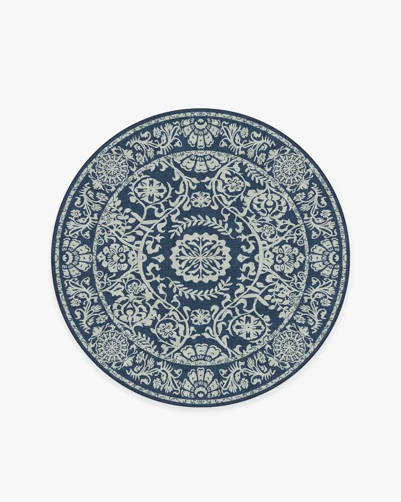 Delphina Navy Blue Rug takes its design cues from the art of woodblock printing. Featuring intricate floral and vine details, this navy blue rug plays up a classic style in a modern colorway.