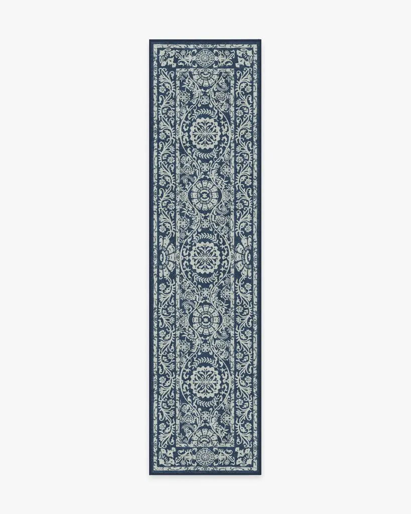 Delphina Navy Blue Rug takes its design cues from the art of woodblock printing. Featuring intricate floral and vine details, this navy blue rug plays up a classic style in a modern colorway.