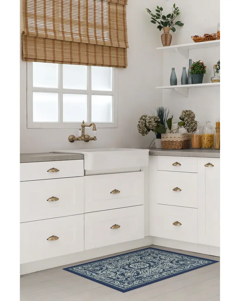 Delphina Navy Blue Rug takes its design cues from the art of woodblock printing. Featuring intricate floral and vine details, this navy blue rug plays up a classic style in a modern colorway.