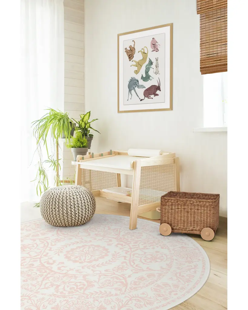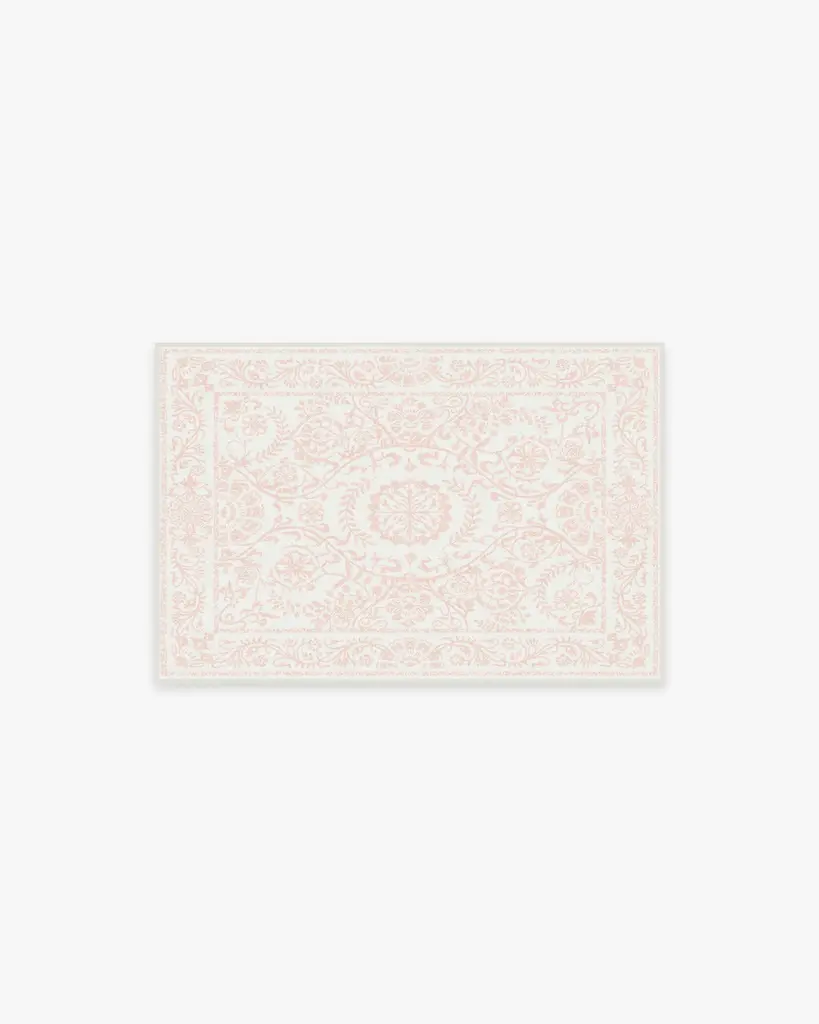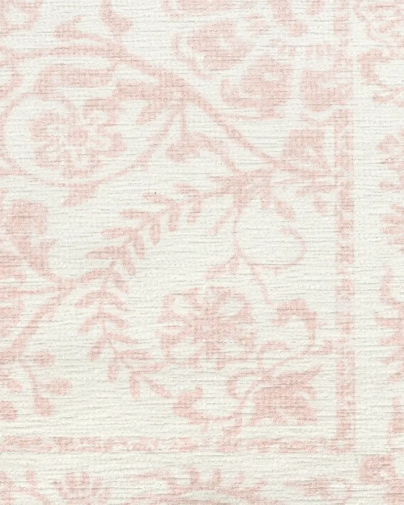 Pink power. Our Delphina Powder Pink Rug features a lovely design texture inspired by the art of woodblock printing. Highlighted by a web of ombre pink floral vines that lead to a blossoming central medallion, its two-tone color palette harmoniously blends into a titanium white background, creating a soothing vibe for your home. Water-resistant, stain-resistant, and machine-washable.