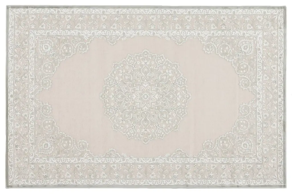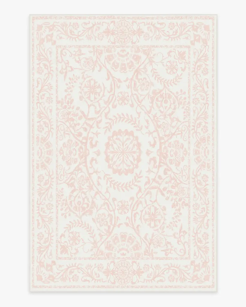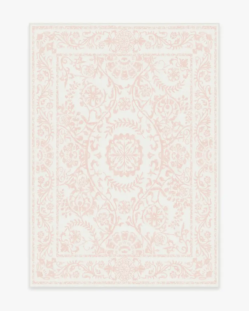 Pink power. Our Delphina Powder Pink Rug features a lovely design texture inspired by the art of woodblock printing. Highlighted by a web of ombre pink floral vines that lead to a blossoming central medallion, its two-tone color palette harmoniously blends into a titanium white background, creating a soothing vibe for your home. Water-resistant, stain-resistant, and machine-washable.