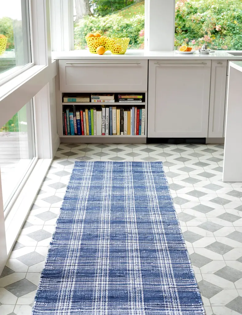 Think of this rug as you would your favorite jeans it's just that versatile and essential, from living room to office. The plaid is woven from cotton yarns in every shade of blue (with hints of ivory), to achieve the broken-in effect of much-loved denim.