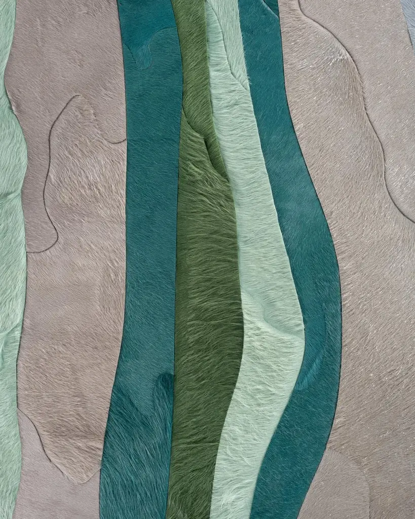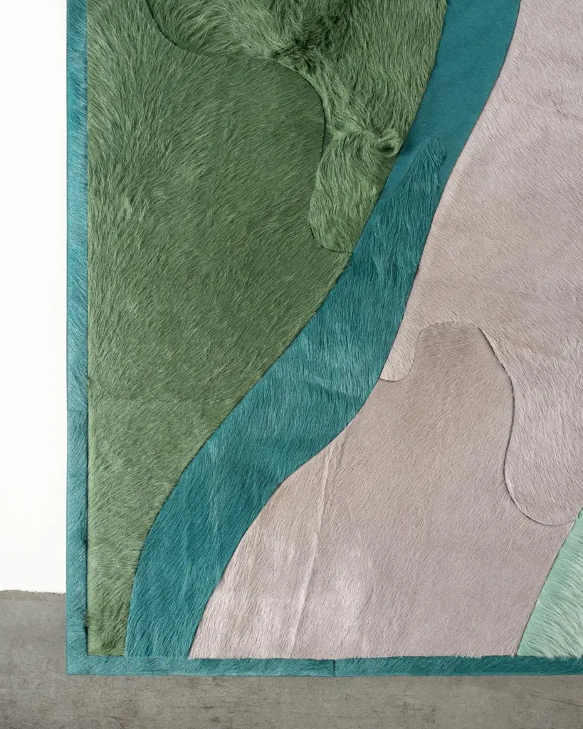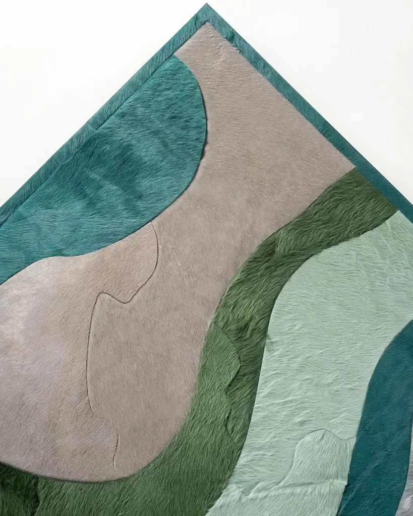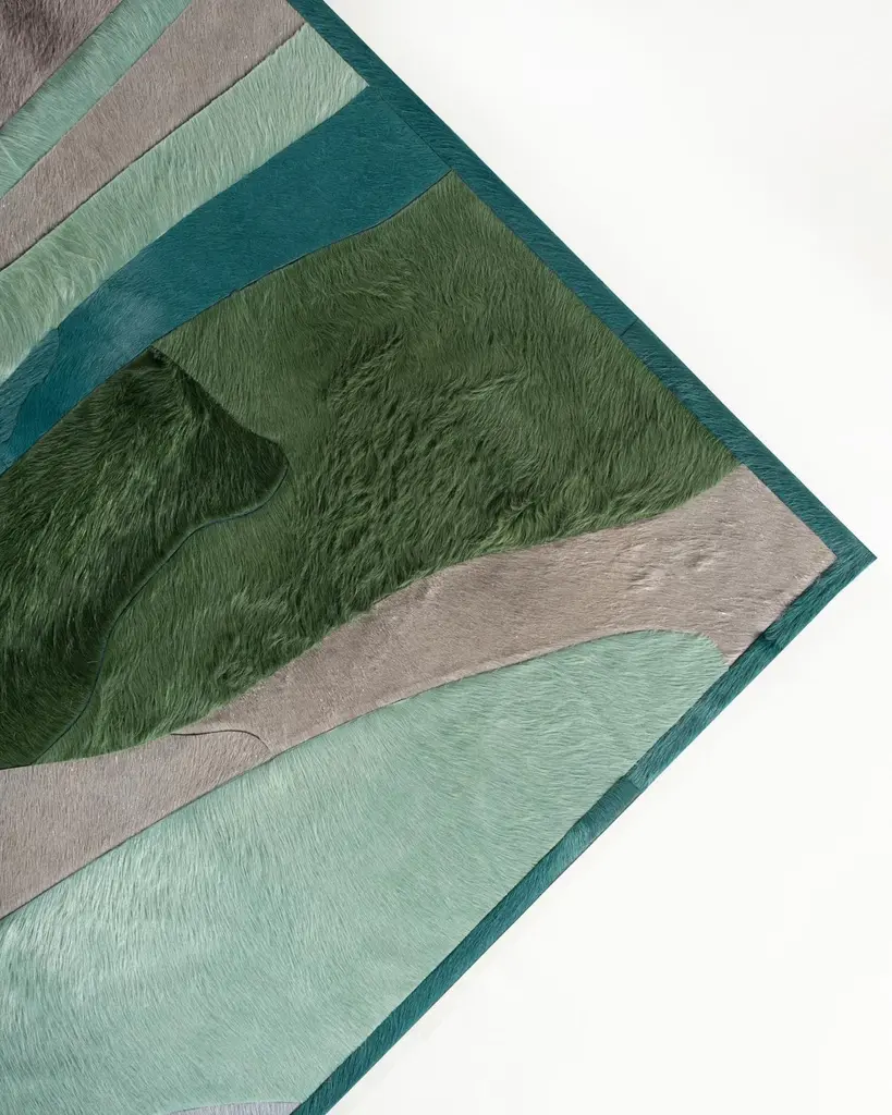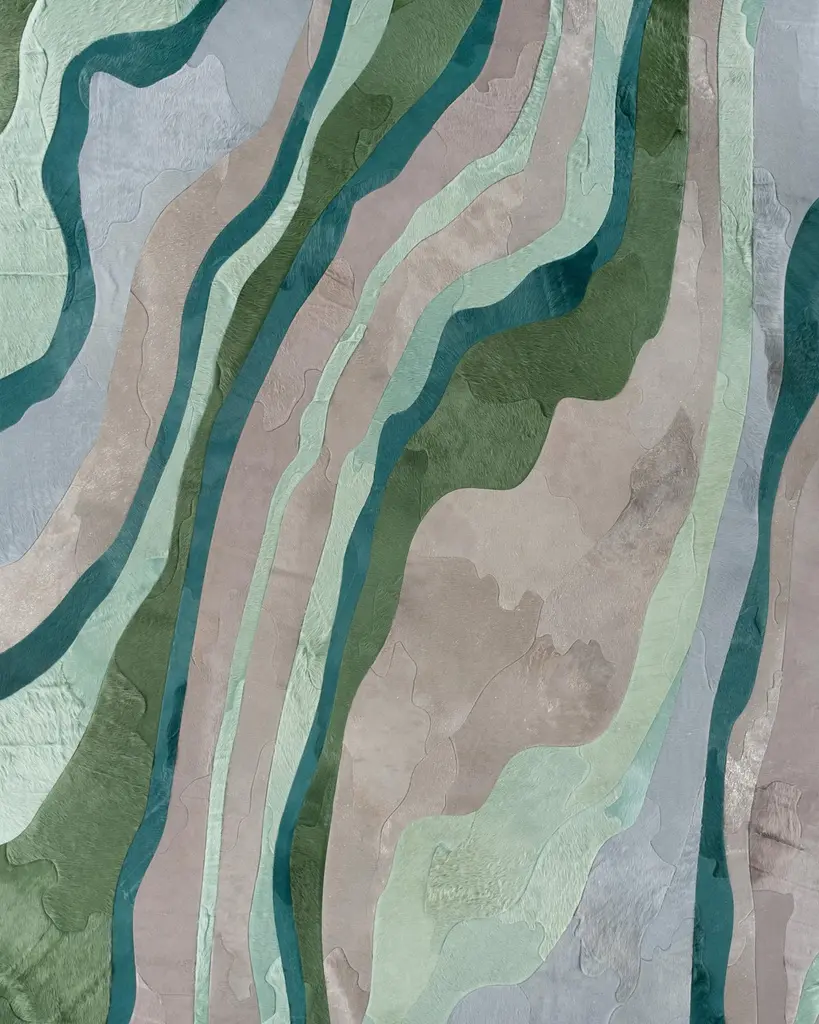This Submerge Hide Rug was designed in collaboration between Kyle Bunting and Interior Designer Marc Thee for their 2018 rug collection. About the Design:Through extreme heating and cooling, magma builds, overflows and cumulates, creating the varying widths and depths of the Earth’s soil and rock. Submerge emulates these layers by using various organic shapes of hide that seem to shift and move as they flow from the design’s central core.Materials & Assembly:This rug will be made from the finest French Charolais leather that has been dyed in Italy before being imported to the USA where it will be assembled by hand by artisans.Non-Slip Backing:This item comes with a proprietary non-slip backing which eliminates the need for a rug pad.Design Colors:Graphite;Lagoon;Mint;Pine;Smoke;Stone