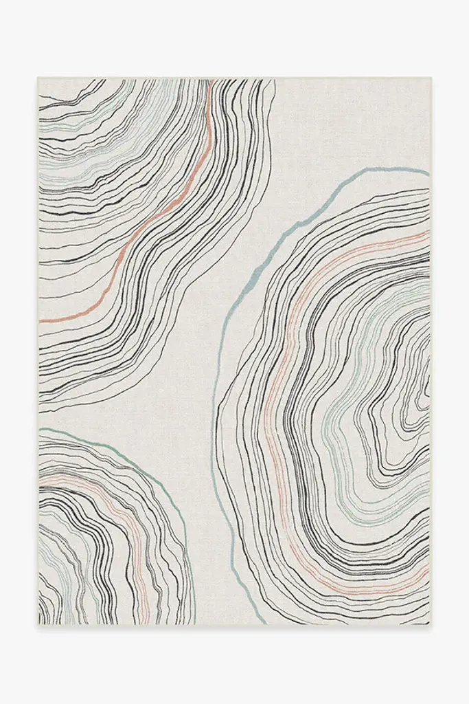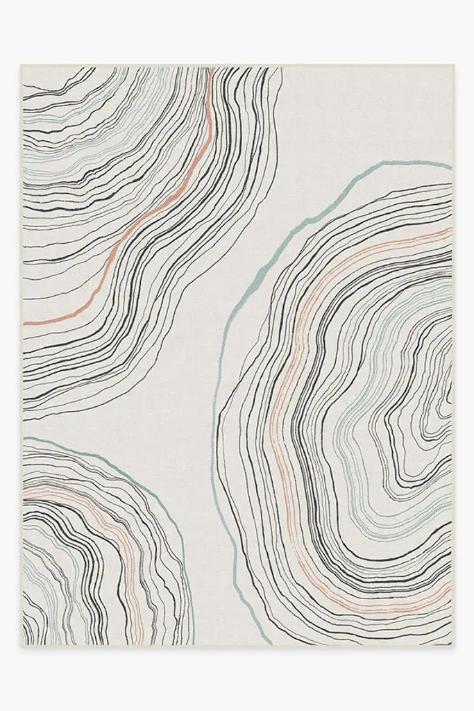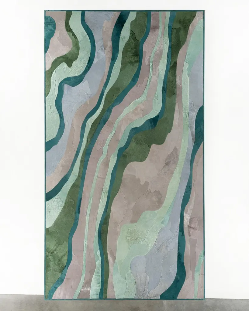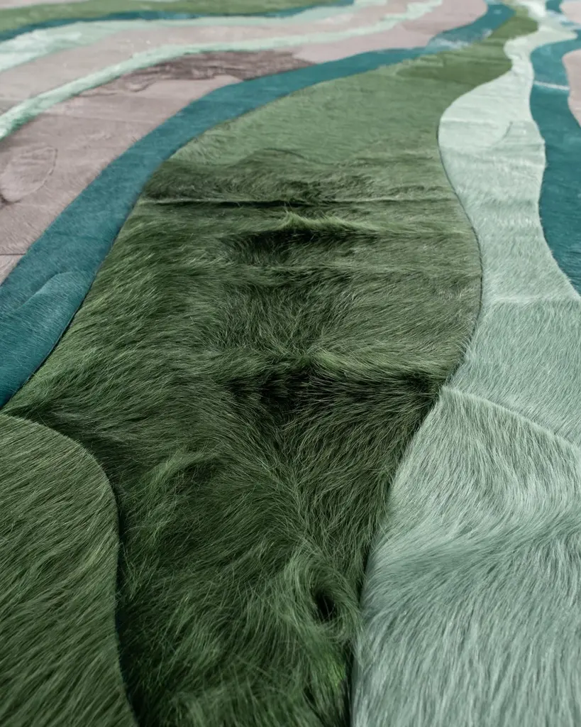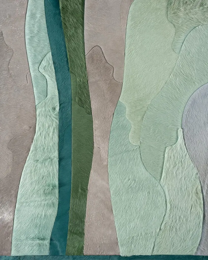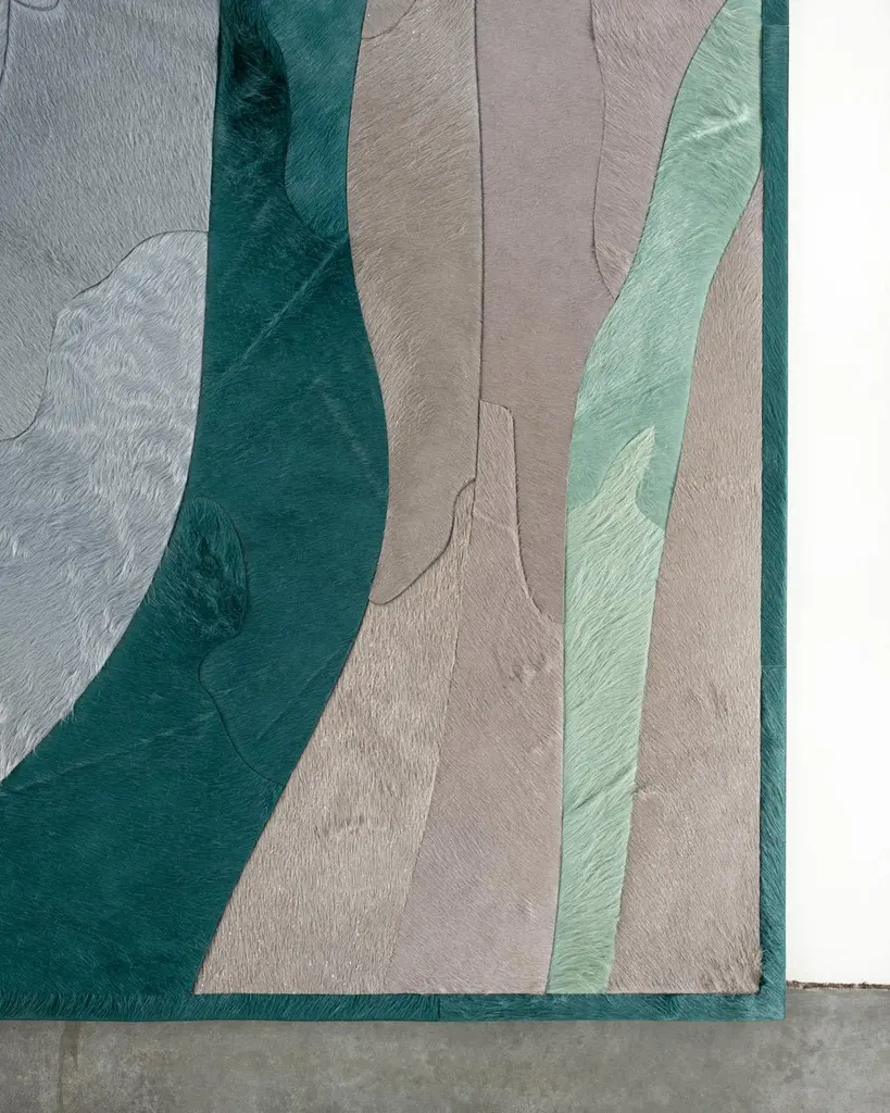 This Submerge Hide Rug was designed in collaboration between Kyle Bunting and Interior Designer Marc Thee for their 2018 rug collection. About the Design:Through extreme heating and cooling, magma builds, overflows and cumulates, creating the varying widths and depths of the Earth’s soil and rock. Submerge emulates these layers by using various organic shapes of hide that seem to shift and move as they flow from the design’s central core.Materials & Assembly:This rug will be made from the finest French Charolais leather that has been dyed in Italy before being imported to the USA where it will be assembled by hand by artisans.Non-Slip Backing:This item comes with a proprietary non-slip backing which eliminates the need for a rug pad.Design Colors:Graphite;Lagoon;Mint;Pine;Smoke;Stone