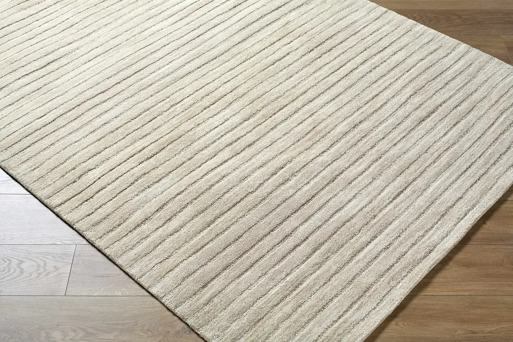 Collection: Destry Colors: Beige, Taupe, Cream Construction: Hand Tufted Material: 100% Wool Pile: Medium Pile Pile Height: 0.3" Styles: Transitional,Traditional Made In: India Thickness: 0.5" Price Range: $$$$$ (Affordable)