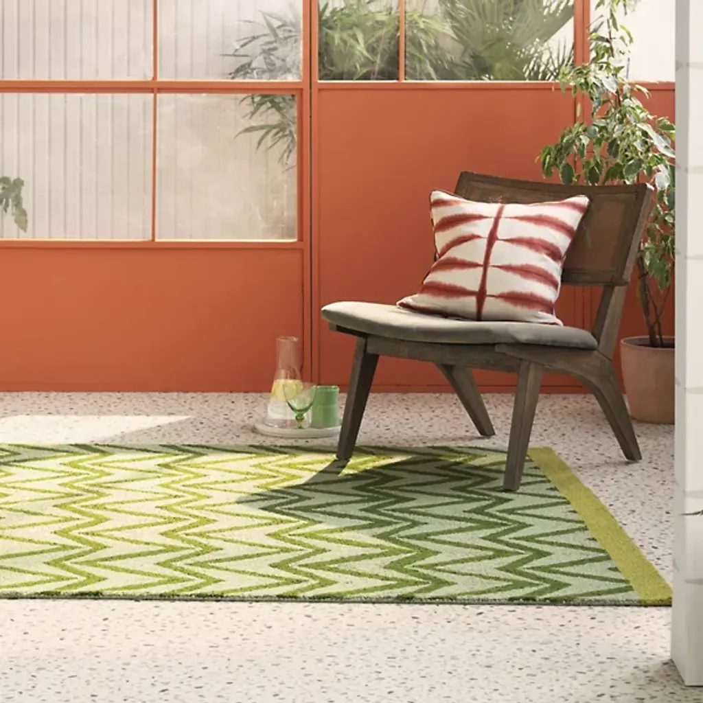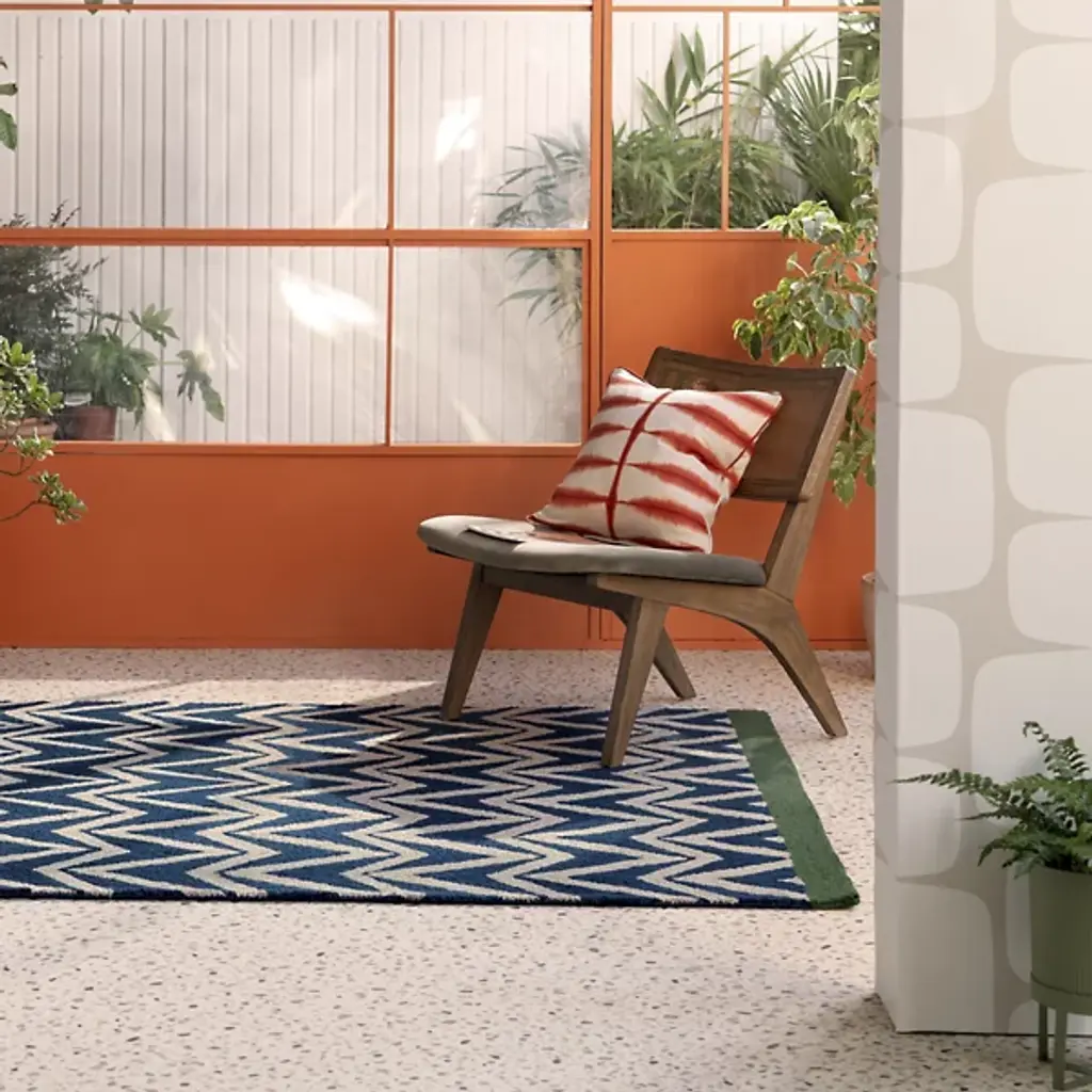 The Dhurrie Outdoor Area Rug from Scion Living is made to bring a playful, stylish touch to your garden or patio. Its design features a simple chevron pattern that’s both bold and calming. Hand-tufted in a soft loop pile from 100% recycled PET, it’s durable, eco-friendly, and perfect for adding charm to any outdoor space.