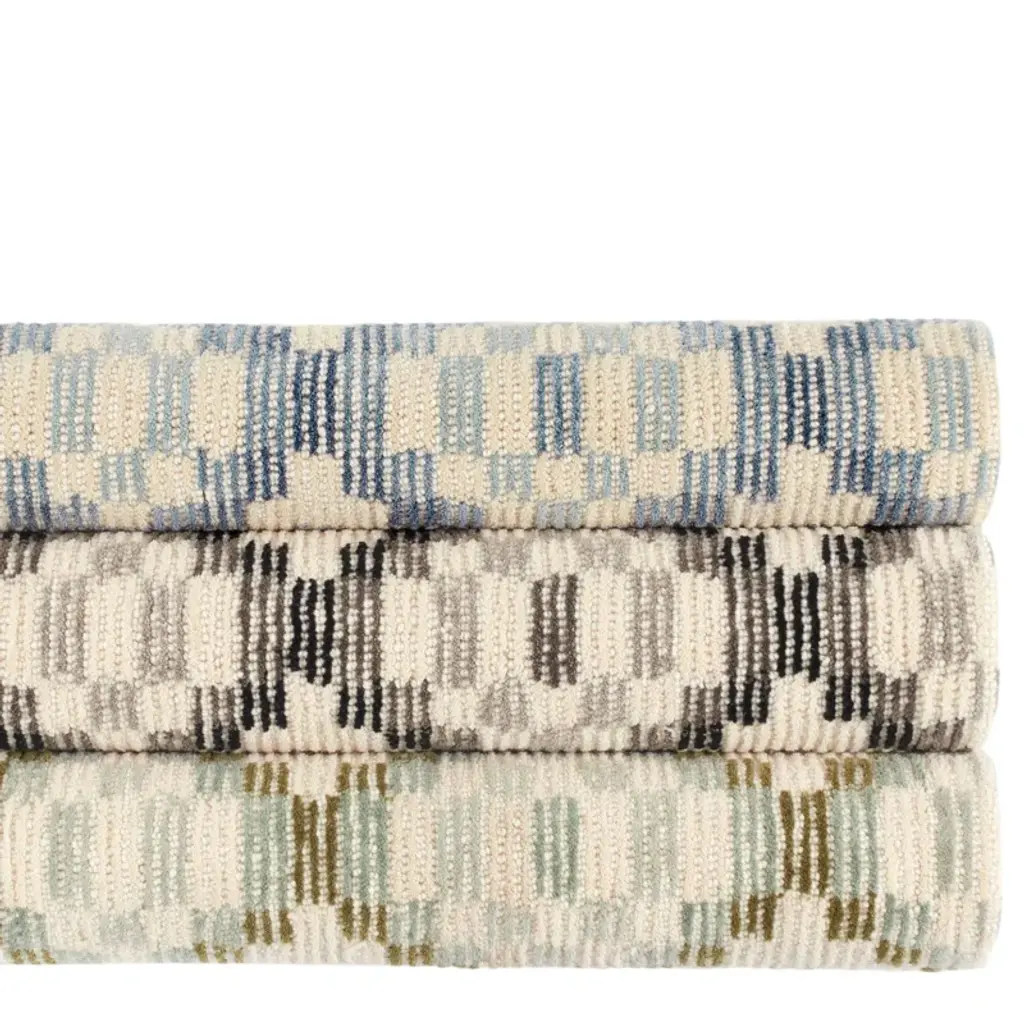 This beautiful, classic wool carpet embodies a fusion of traditional and modern geometric patterns that invite you to walk barefoot on its luxuriously plush wool pile. Hand-hooked and sheared to a velvety raised corduroy rib, then micro-striped with alternating solid white hooked loops to create an optical muting effect.