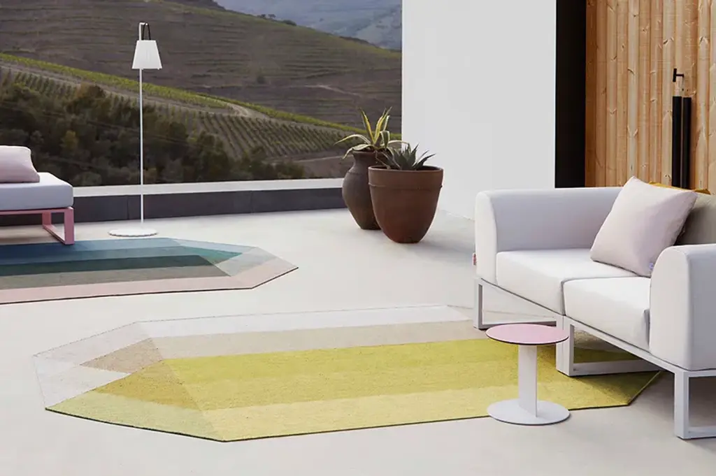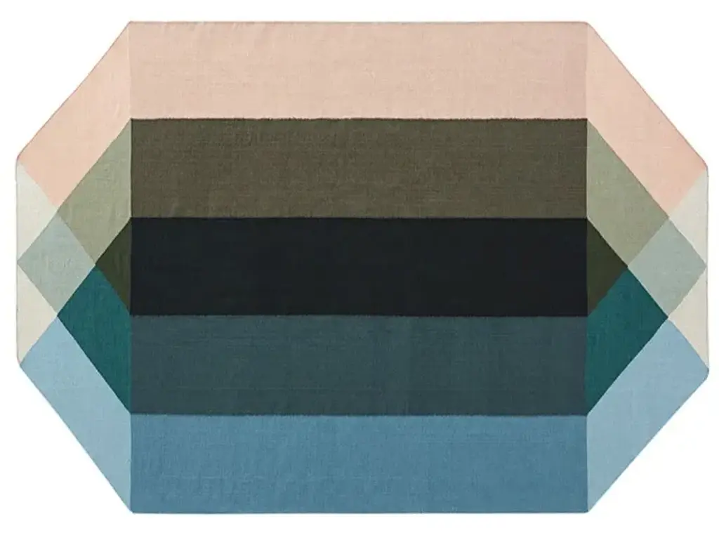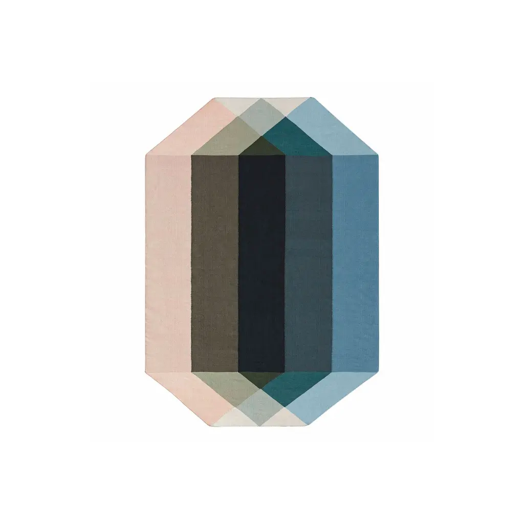 Charlotte Lancelot has created three new color combinations for her popular collection of DIAMOND kilim rugs for GAN, made of recycled fibers from plastic materials (100% recycled PET).DIAMOND, with its perceived transparencies and gradients, is now introduced in more natural tones, such as Blue-Brown, Green-Grey and Orange-Wine. The new options join the existing colorways: Pink-Yellow, Nude-Petrol and Blue-Green.DIAMOND’s octagonal shape is inspired by the geometry of the diamond, a universal symbol of strength and beauty, to which its facets and hypnotic figure bring a new meaning.These rugs, suitable for outdoor and indoor spaces thanks to their recycled PET composition, are available in three sizes.The fibers with which DIAMOND kilim rugs are crafted by hand go through a meticulous treatment and regeneration process that lengthens the useful life of the existing plastic. This gives them a new purpose (upcycling) and turns them into a piece of contemporary design that is also easy to clean and maintain.