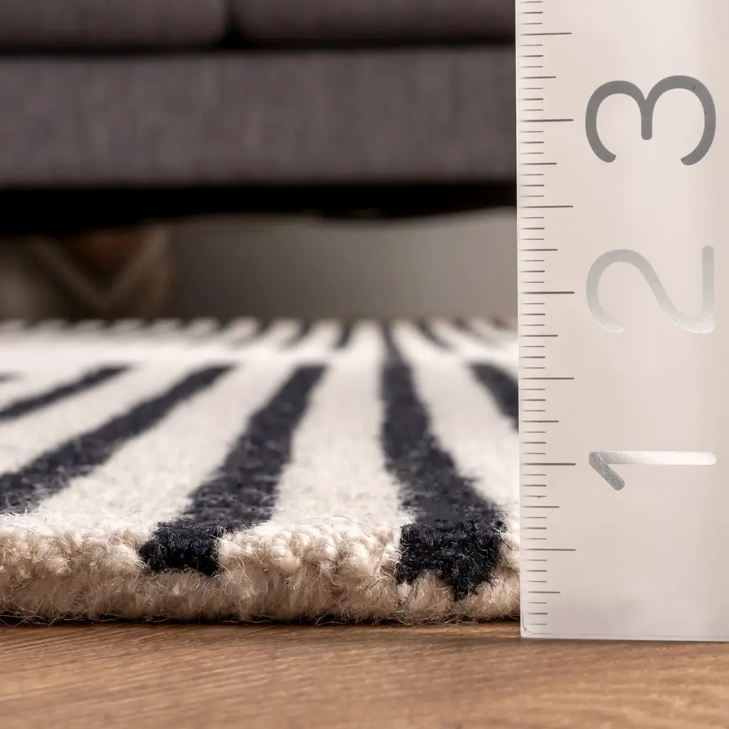 Add an effortless flair with our simple yet regal area rugs. Handmade using lush wool fibers, this sophisticated floor piece can seamlessly integrate with any existing decor. Wavering pinstripes in a warm and neutral color scheme elevate the ambiance of your living space, while the design creates sharp contrast and comfort. Guaranteed to add a fresh element to any space. Make the most of your time at home with our pet-friendly and easy to clean area rugs.