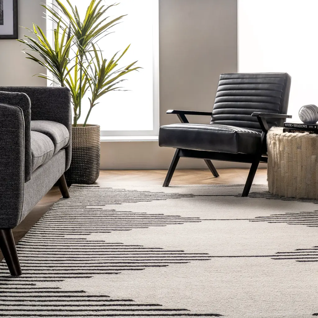 Add an effortless flair with our simple yet regal area rugs. Handmade using lush wool fibers, this sophisticated floor piece can seamlessly integrate with any existing decor. Wavering pinstripes in a warm and neutral color scheme elevate the ambiance of your living space, while the design creates sharp contrast and comfort. Guaranteed to add a fresh element to any space. Make the most of your time at home with our pet-friendly and easy to clean area rugs.